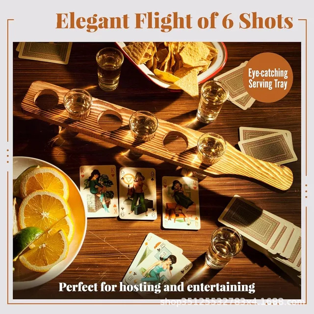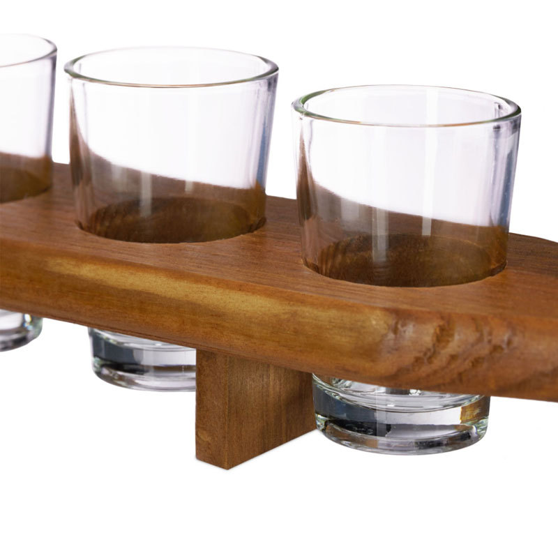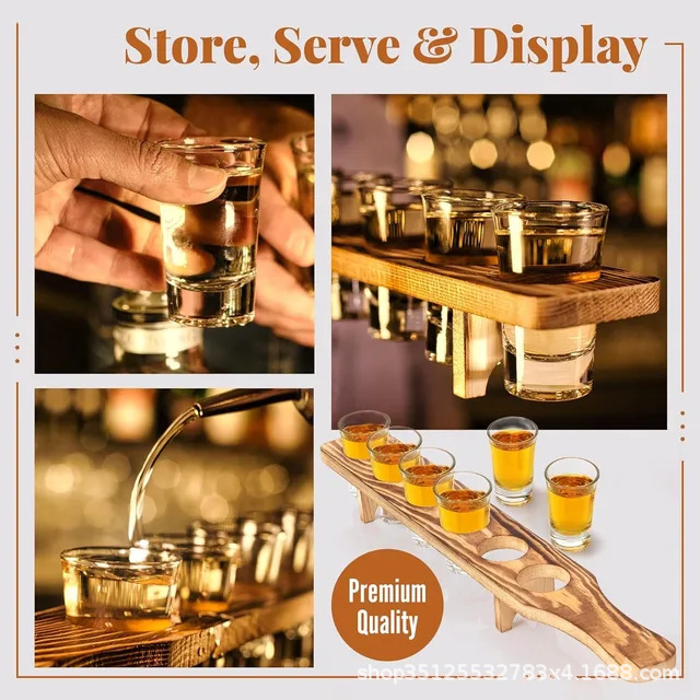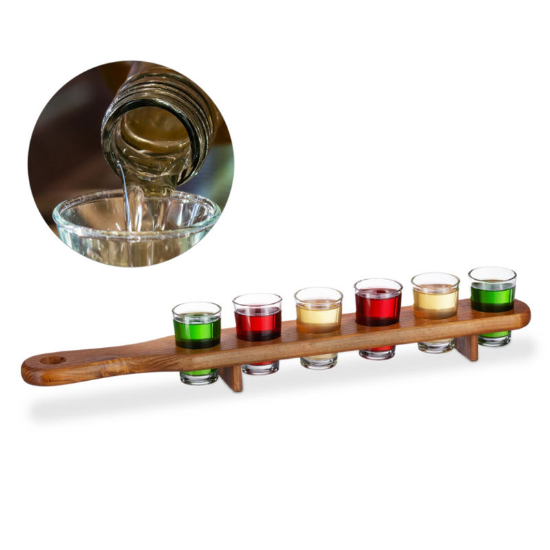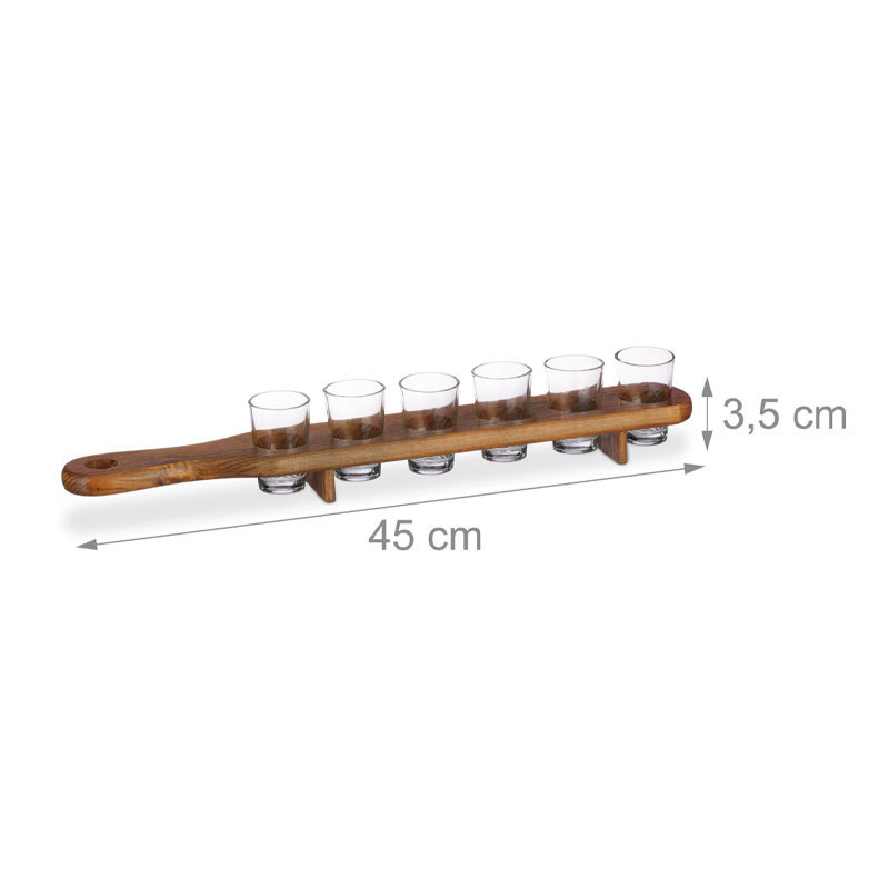 Практичен и стилен комплект, съставен от 6 бр. стъклени шотове с височина 7 см. и с вместимост 50 мл., и бамбукова поставка с размери 7 х 42 х 2 см.