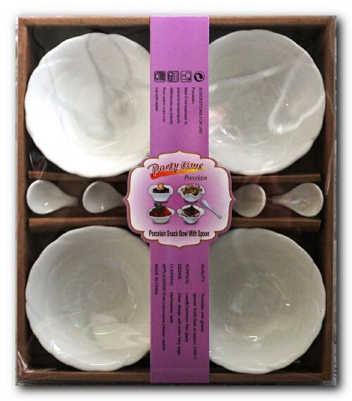Комплектът включва четири дълбоки купички с лъжички, изработени от порцелан, отличаващ се със своята здравина и плътност. Подходящи за сервиране на предястие, десерт, сосове, ядки и други изкушения.