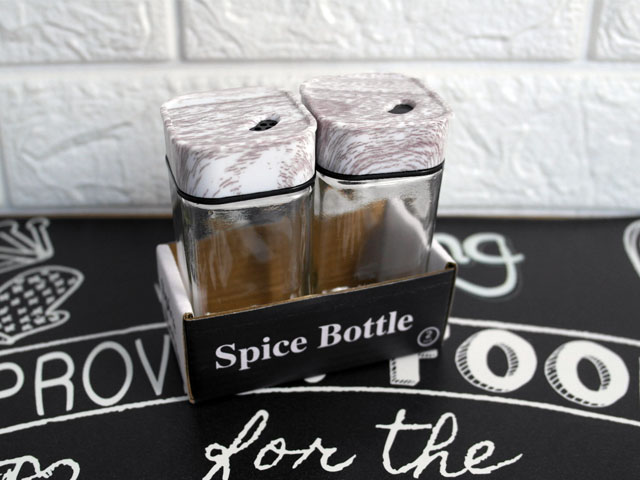 Комплект, съставен от две солнички със стъклено бурканче и с пластмасова капачка.