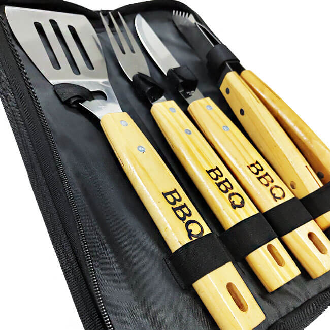 Комплект за барбекю 4 части с дървени дръжки в плик е идеалният аксесоар за любителите на грилованата храна. Съчетавайки функционалност и стил, този комплект е перфектният избор за вашите грилове на открито.