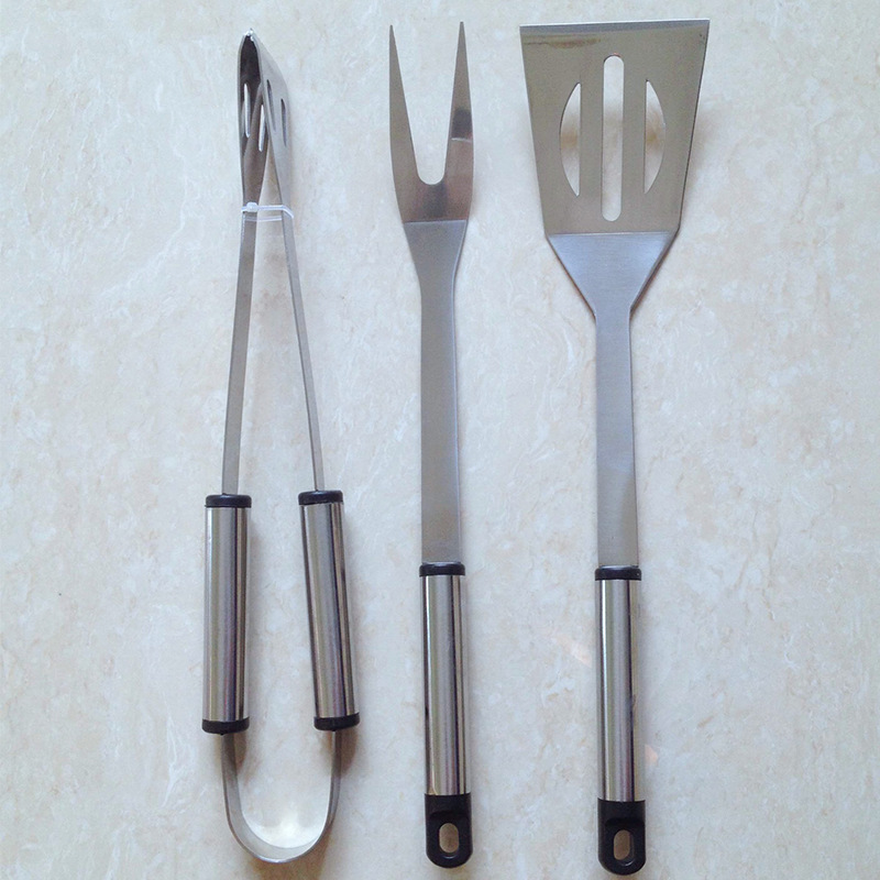 Той съдържа шпатула, вилица и щипка за барбекю.