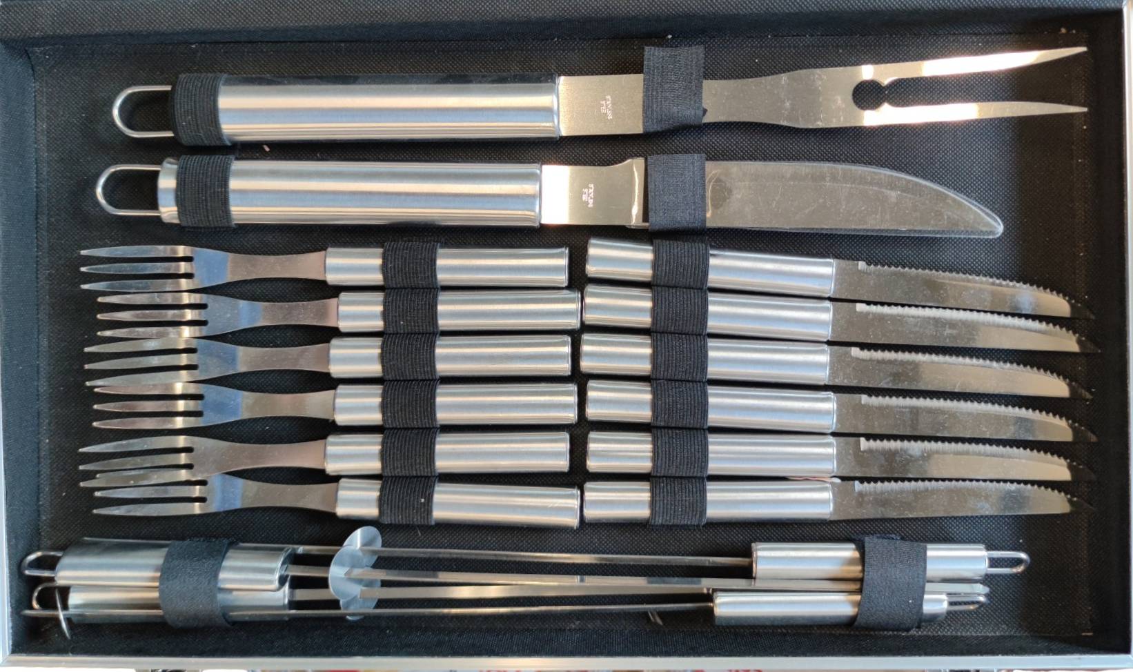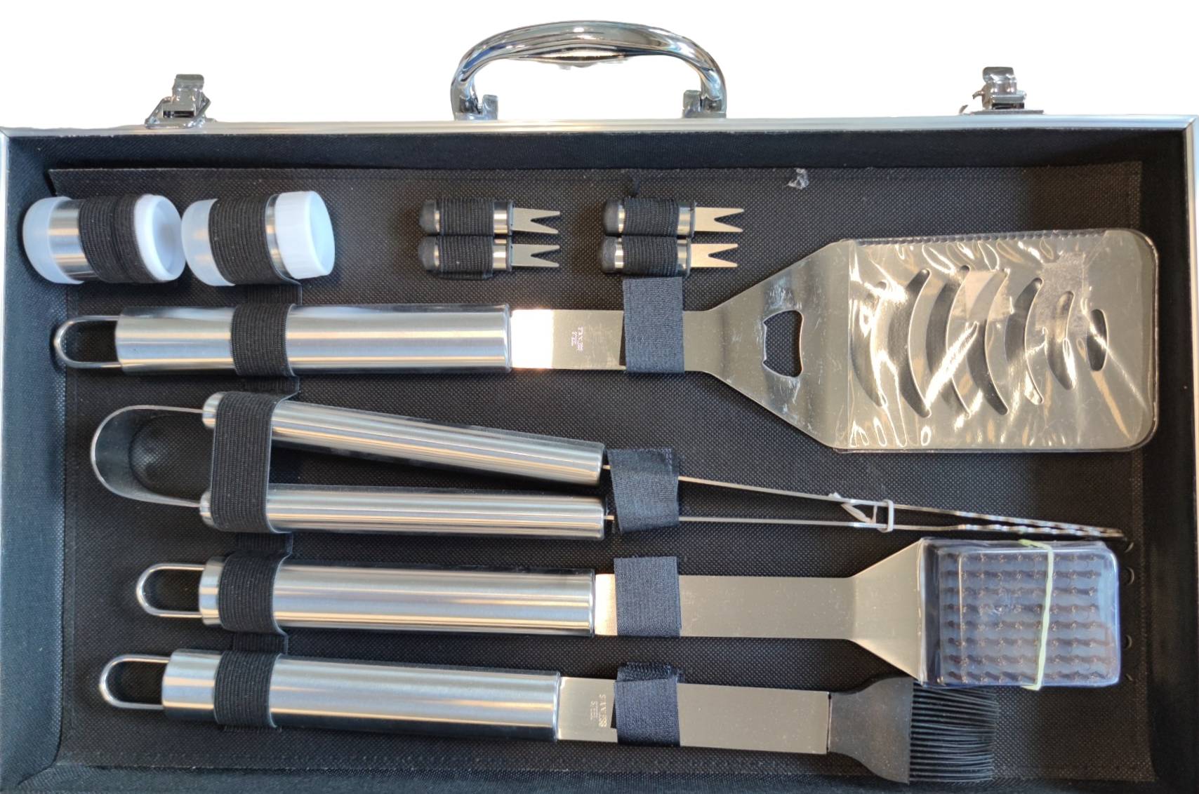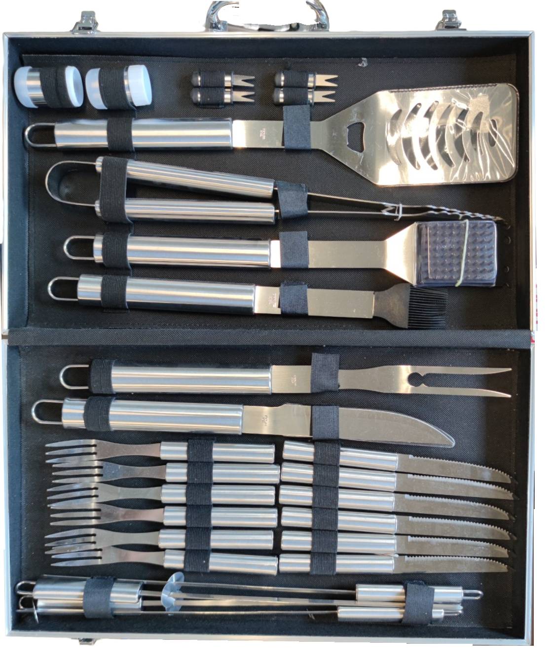 Комплект за барбекю в метален куфар с 28 части, създаден специално за любителите на скарата. Този комплект прибори за скара е идеален за шест човека и предлага всички необходими аксесоари за барбекю, събрани в удобна и стилна кутия за барбекю с инструменти. Подходящ е както за семейни събирания, така и за приятелски партита на открито.