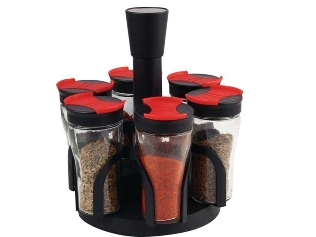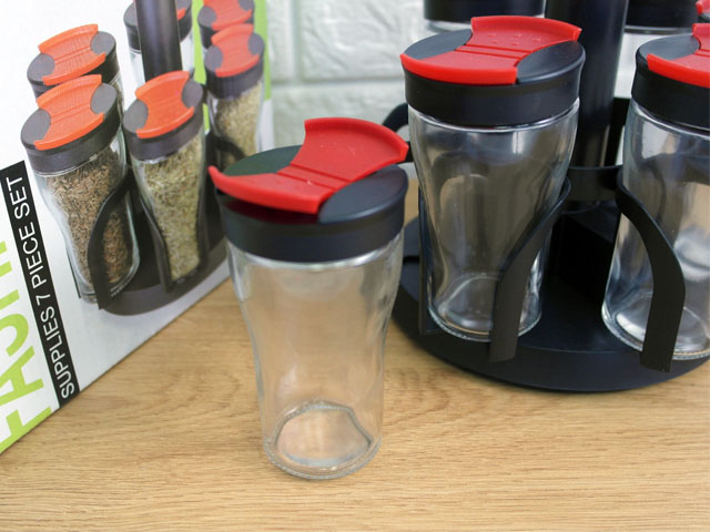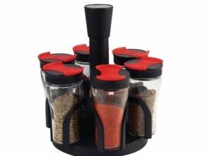 Комплект за подправки "Contempo" с размер Н21,5х20,5 см., съставен от 7 части - въртяща се стойка, с пластмасова основа и 6 бр. стъклени буркачета за подправки с размер Н10,5 см., с пластмасови капачки.