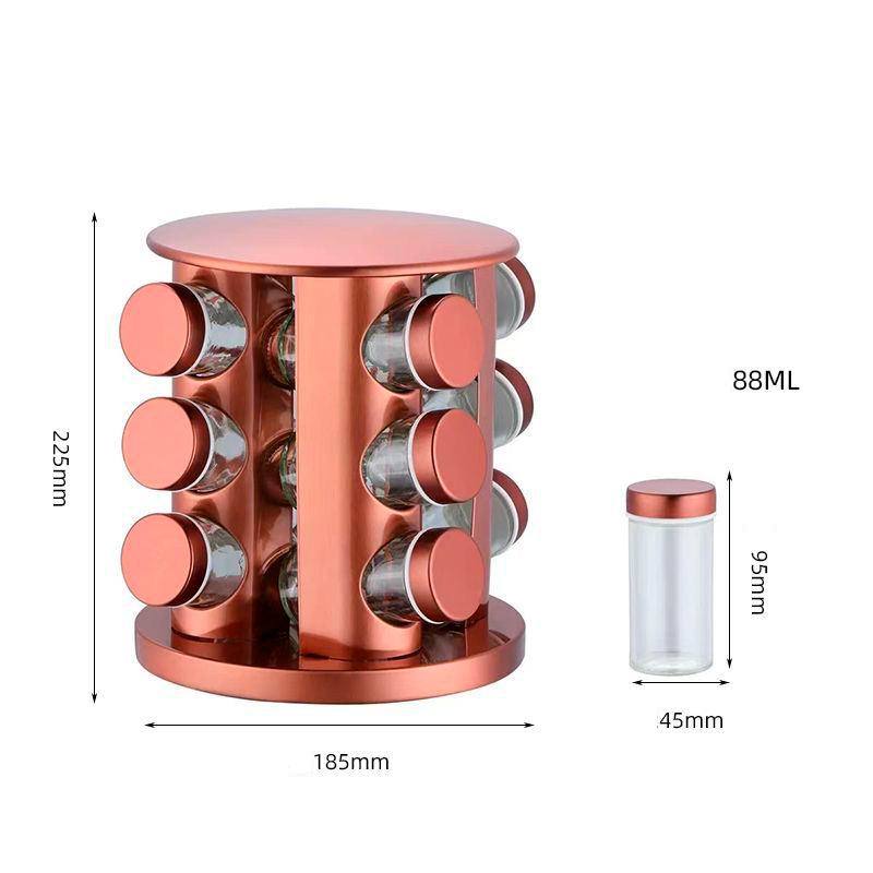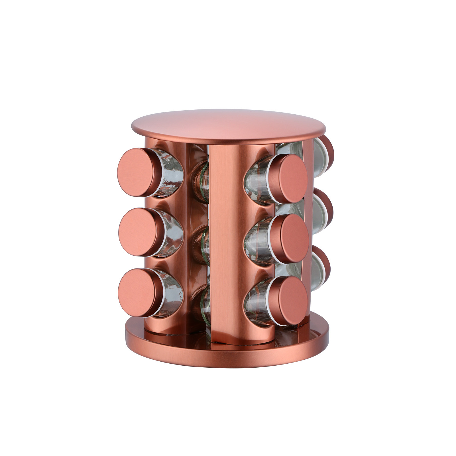 Комплект за подправки "Профи" с модерен дизайн, с размер Н22,5х18,5 см. и с тегло 1.861 кг., съставен от 13 части - въртяща се метална стойка и 12 бр. стъклени бурканчета за подправки с размер 9,5х4,5 см. и с капацитет 88 мл., с метална капачка в бронзов цвят.