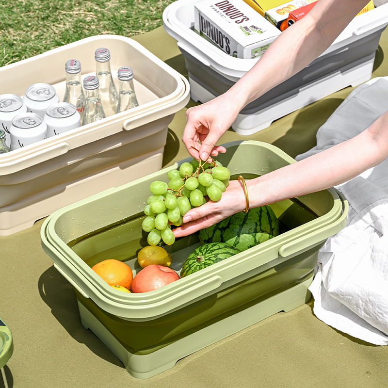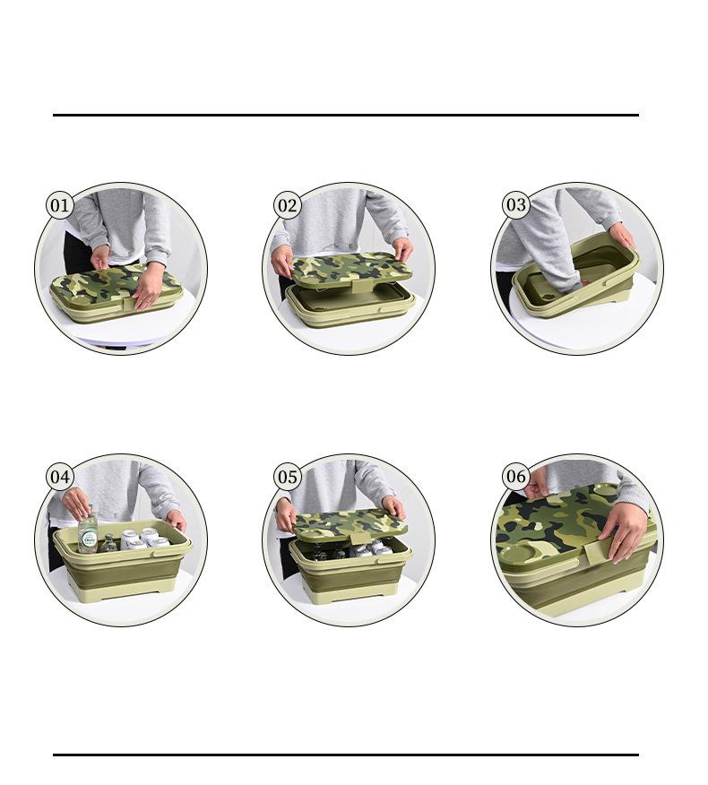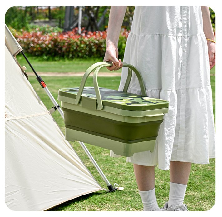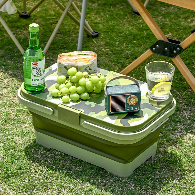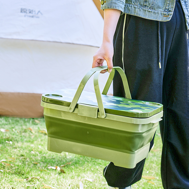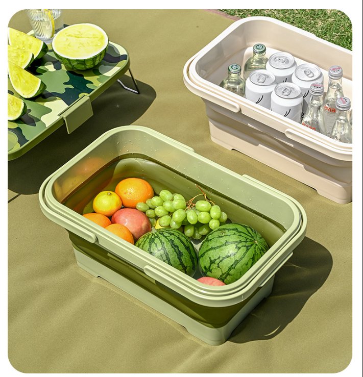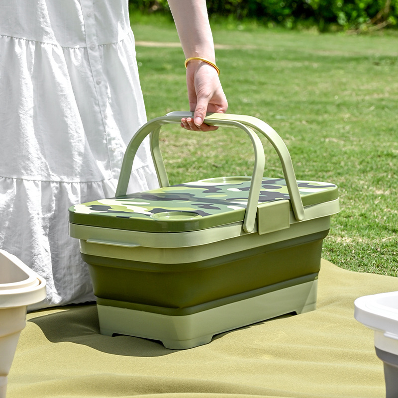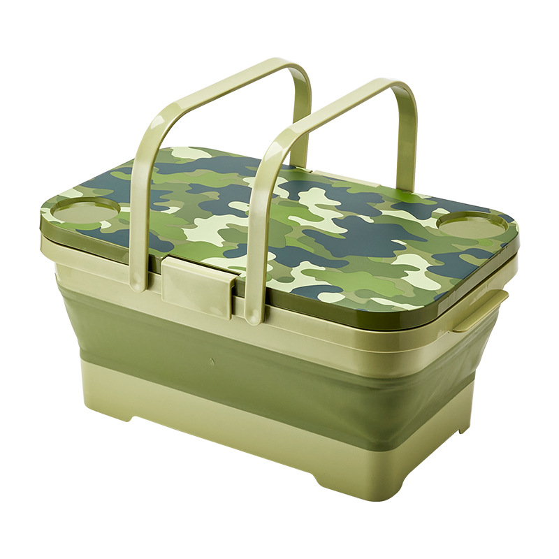 Универсална кошница за пикник, която може да се използва като кошница за пренасяне на продукти, като съд за лед или вода, в който да се държат напитки, плодове и зеленчуци охладени, и капакът се превръща в малка помощна масичка или дъска за рязане, в който има и отвор за поставяне на чаша, кенче или бутилка.