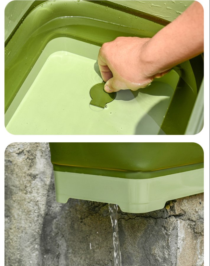 На дъното има тапа, която служи за изтичане на водата, ако се използва като съд за вода или лед или след измиване.