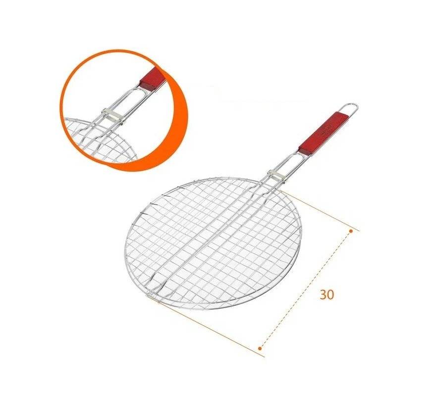 С диаметър от 30 см и дължина на дръжката 50 см, тази скара е удобна за използване и пренос. Хромираната стомана осигурява равномерно приготвяне на храната, а дървената дръжка добавя естествен и стилен вид към уреда.