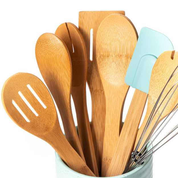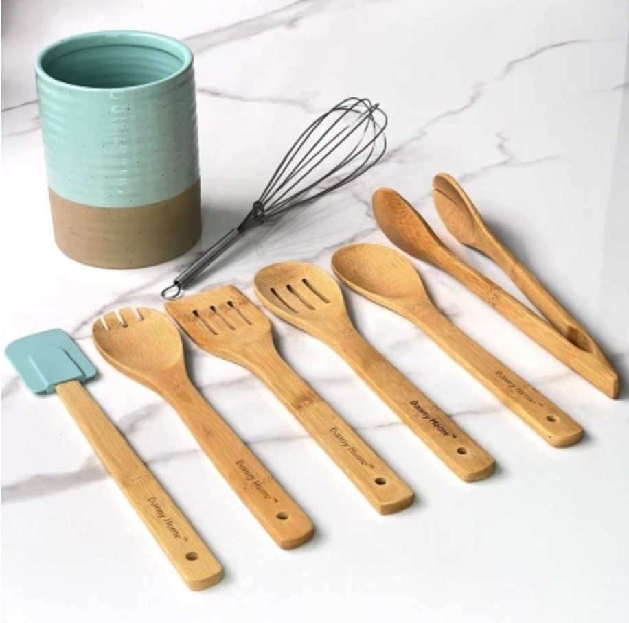 Бамбукът и керамиката придават натурален и модерен вид, а силиконовите и метални прибори са издръжливи и лесни за почистване.
