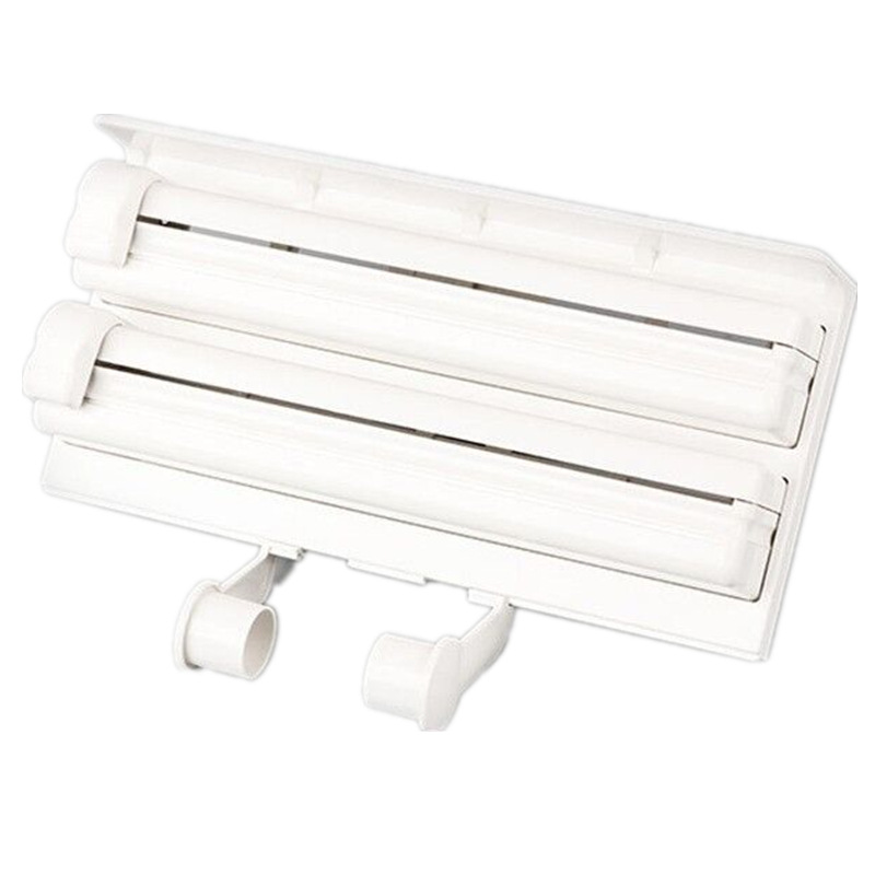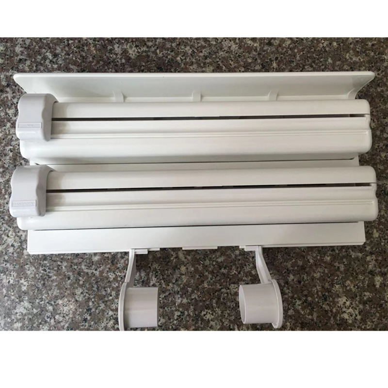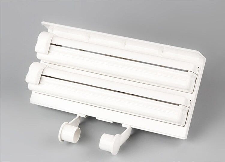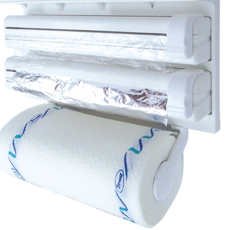 Кухненски органайзер изработен от пластмаса и метал за фолио за опаковка (алуминиево, стреч фолио и др.) и руло кухненска хартия.