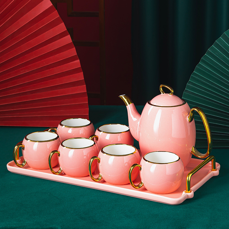 Луксозен керамичен сервиз за чай в розово и златно с поднос