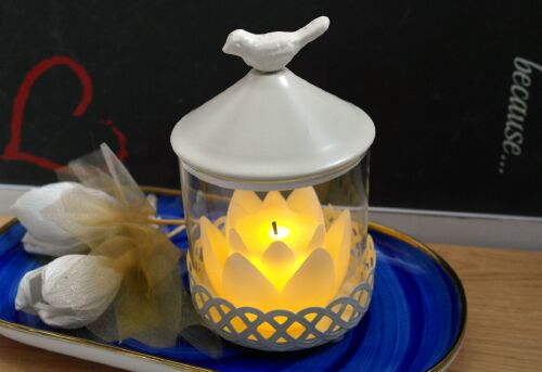Свещникът е изработен от стъкло и метал в бял цвят.