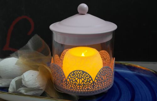 Свещникът е изработен от стъкло и метал в розов цвят.