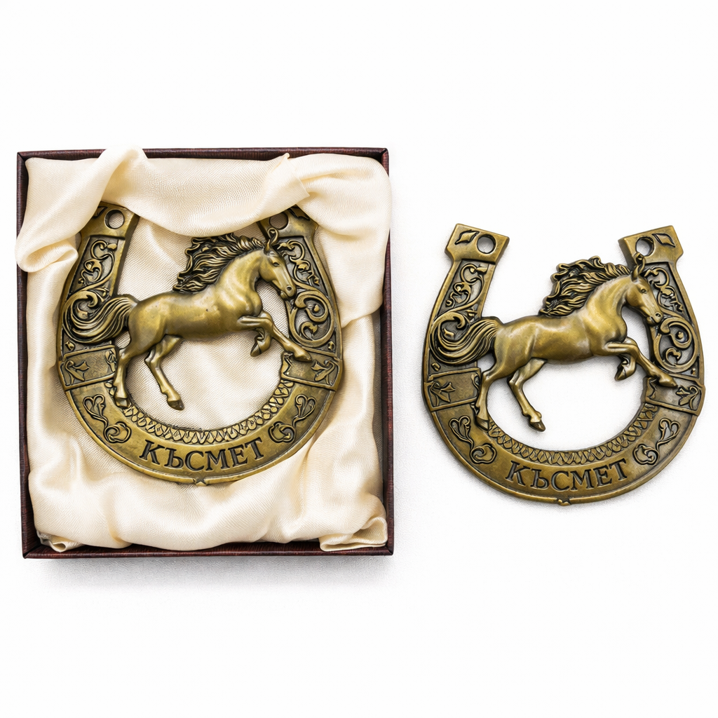 Привлечете позитивна енергия и благополучие в дома си с тази красива метална подкова с надпис "Късмет". С елегантна фигурка на кон и компактни размери, тя е не просто стилна декорация, а силен символ на успех и защита.