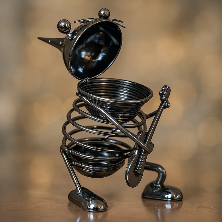 Забавната и стилна метална фигура-моливник "Мишка с китара" е перфектното допълнение към вашия бюро или работно пространство. Този уникален аксесоар не само ще впечатли с визуалния си дизайн, но и е практично и функционално решение за съхранение на моливи и химикалки.