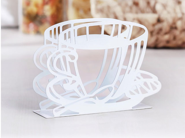Поставката е изработена от метал в бял цвят във формата на чаша кафе.