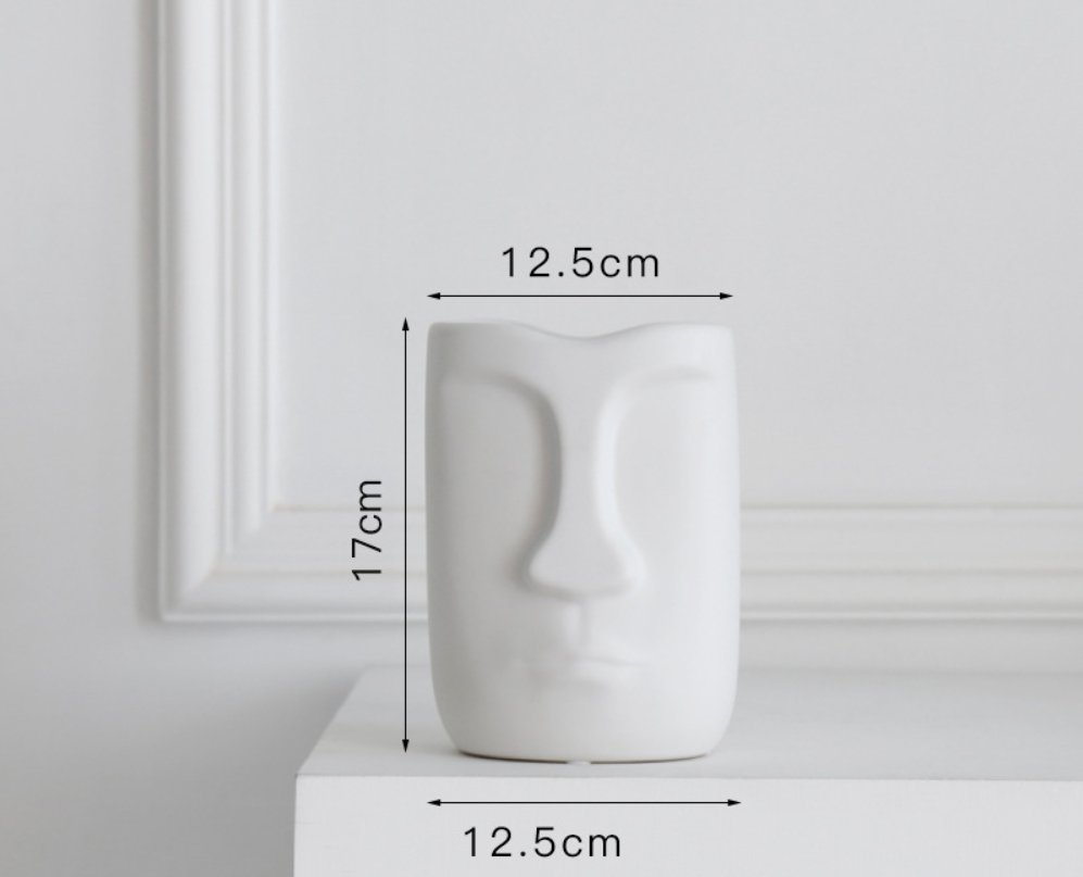 Представяме ви една изключително стилна и модерна ваза, изработена от висококачествена керамика в бял цвят, която привлича вниманието с формата си, представляваща човешко лице. Тази ваза не е просто функционален елемент, а истинско произведение на изкуството, което добавя уникален акцент в дома или офиса ви.
