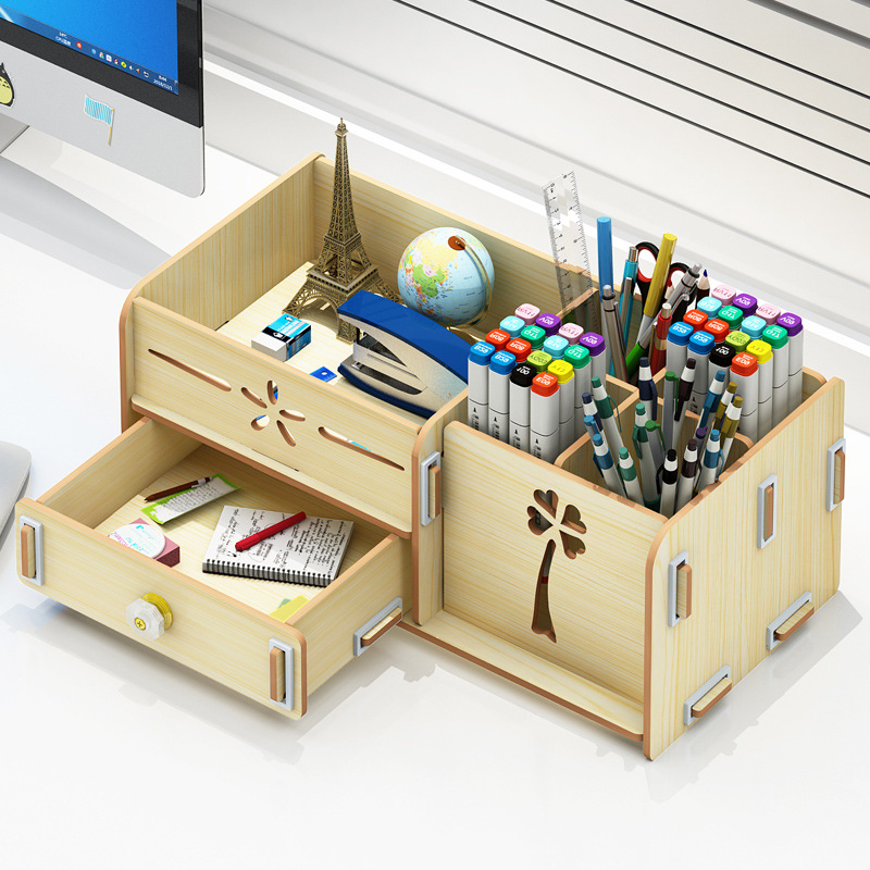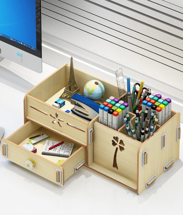 С размери 28 х 13 х 10.5 см, той разполага с чекмедже за дребни предмети с размери 14.5 х 11.5 см и 4 гнезда за организиране на моливи, химикали, маркери и други аксесоари.