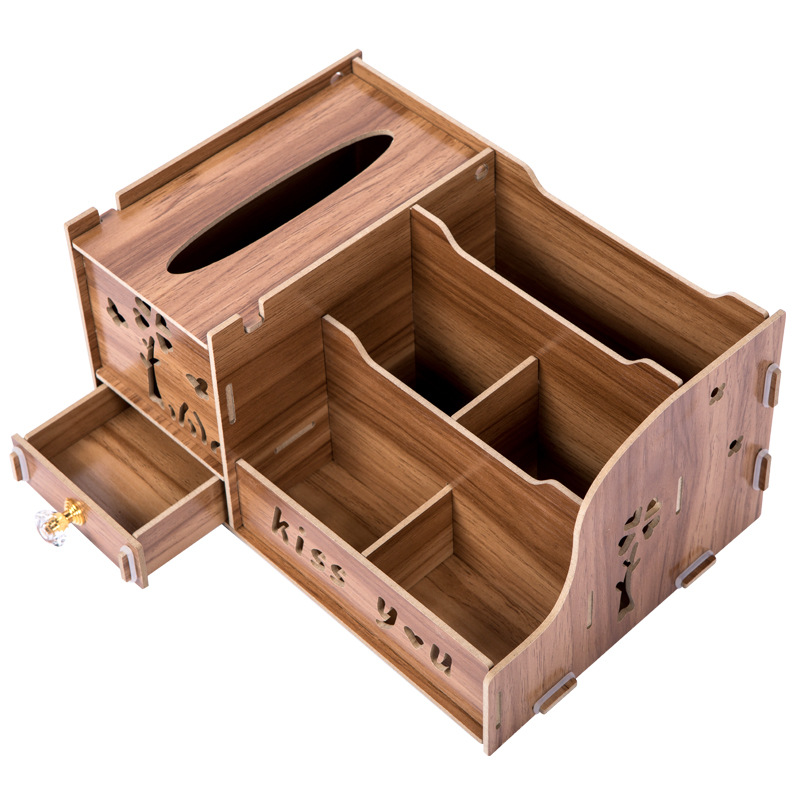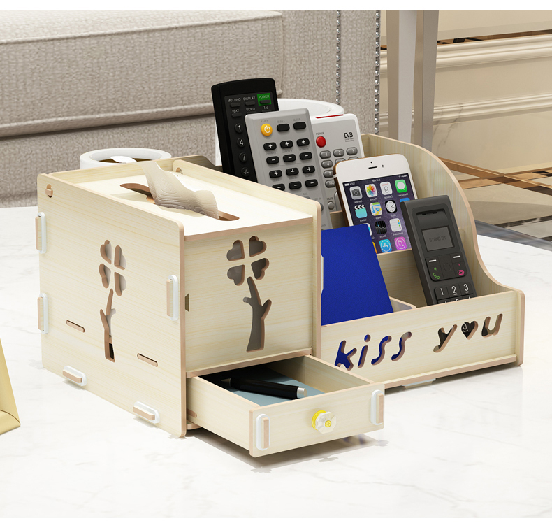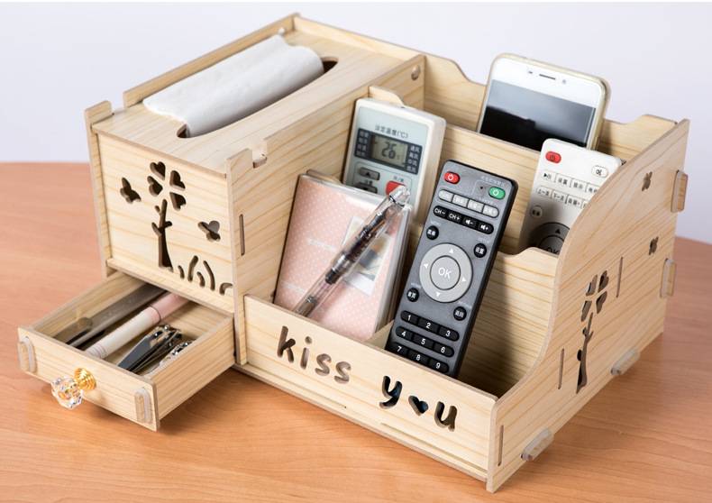 Чекмеджето за дребни предмети (10 х 17 см) и мястото за салфетки (17 х 10 х 8.5 см) с процеп за издърпване са умело интегрирани в дизайна, докато 5 гнезда предоставят организация за телефон, моливи, химикали и маркери.