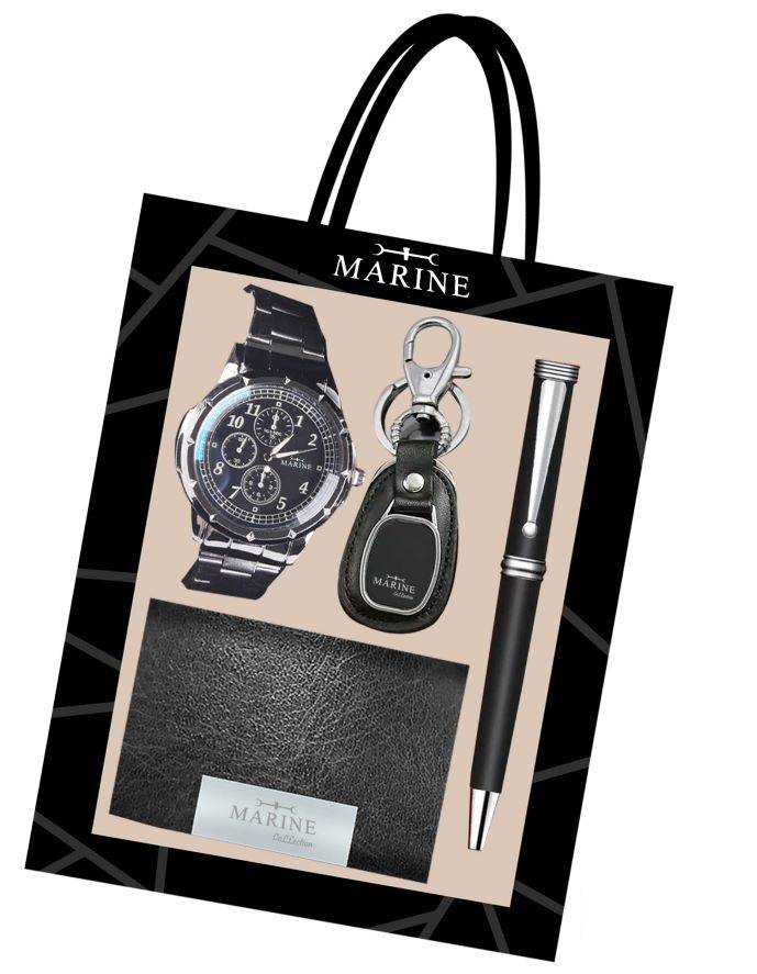 Комплектът съдържа мъжки часовник, ключодържател, химикал, визитник и подаръчна торбичка.