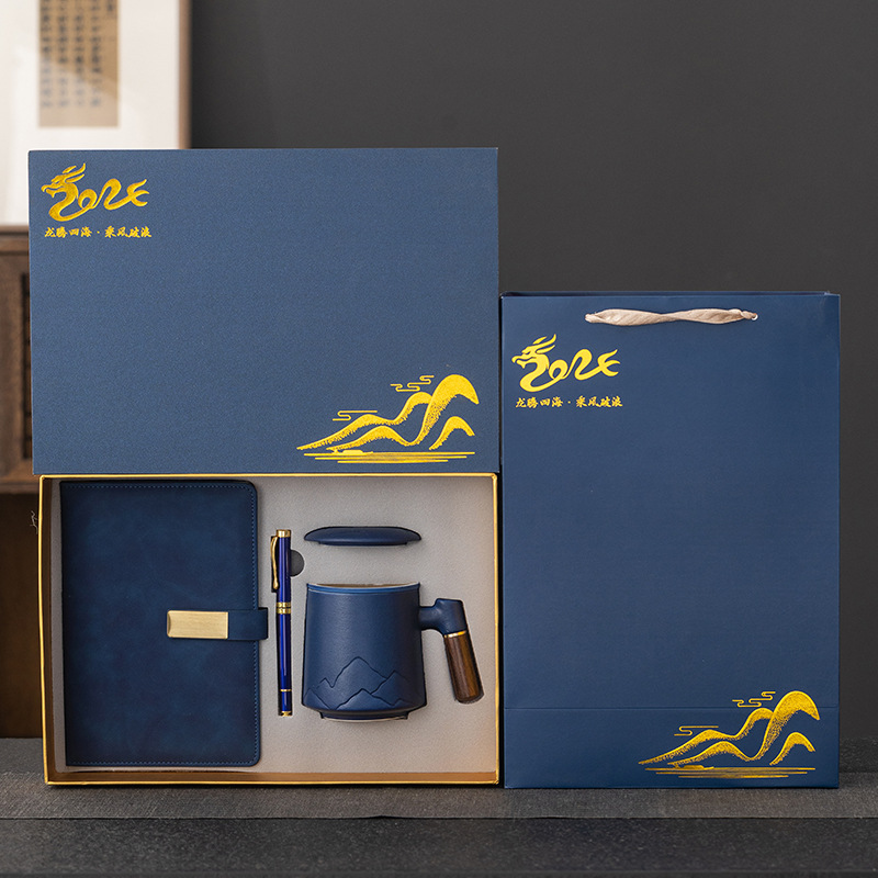 Комплектът съдържа керамична чаша с капаче и цедка, химикал, ежедневник формат A5 и подаръчна кутия.