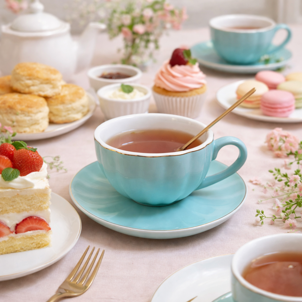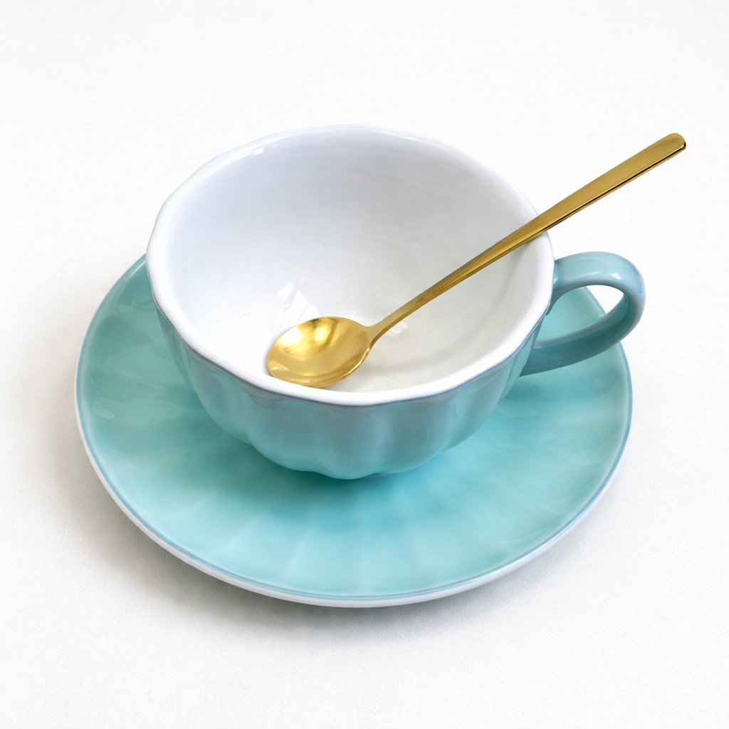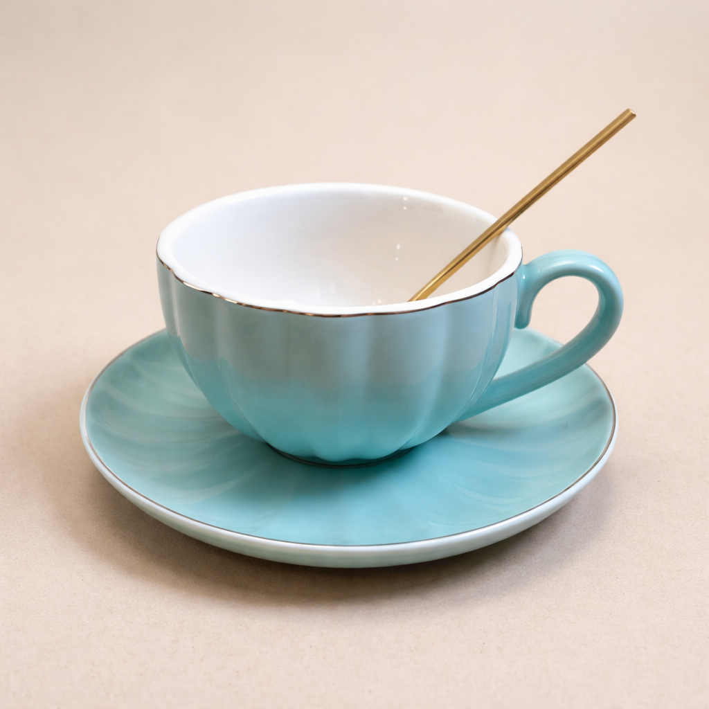 Търсите елегантен начин да поднесете любимата си топла напитка? Порцелановата чаша с чинийка и метална лъжичка в тюркоазено синьо със златист акцент съчетава изискан дизайн и практичност, превръщайки всеки момент в изживяване.