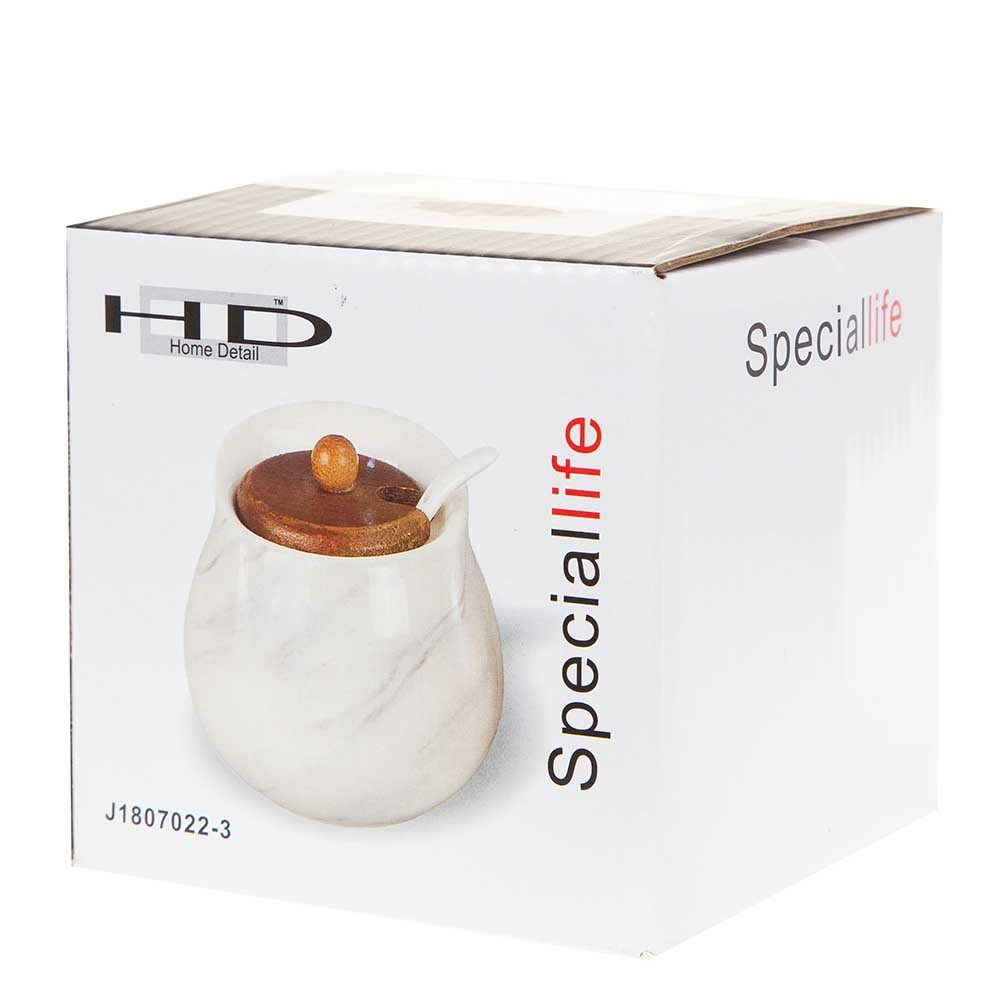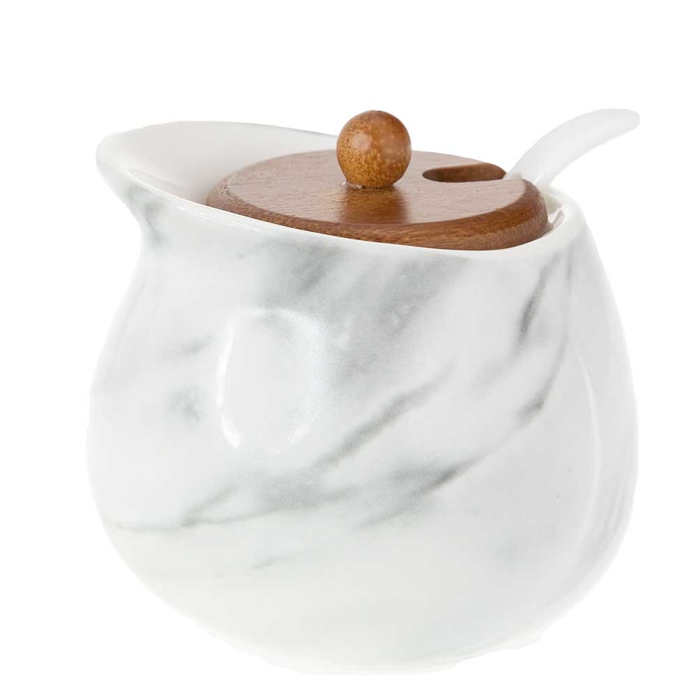 Захарницата е изработена от порцелан с порцеланова лъжичка и бамбуково капаче.