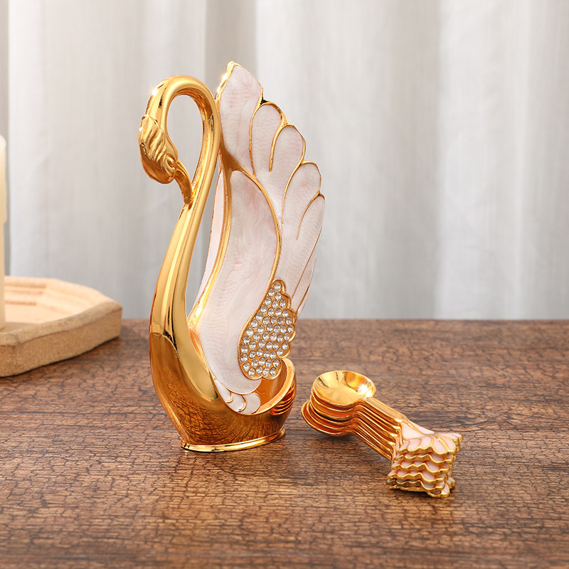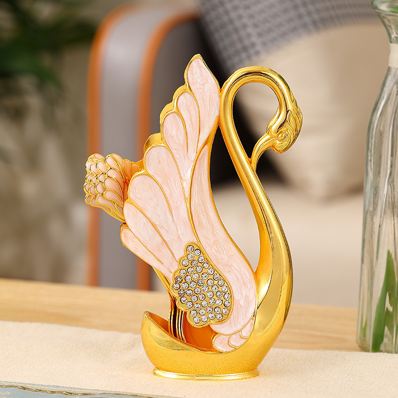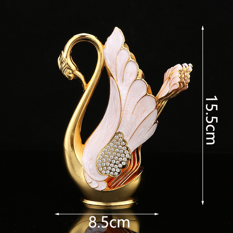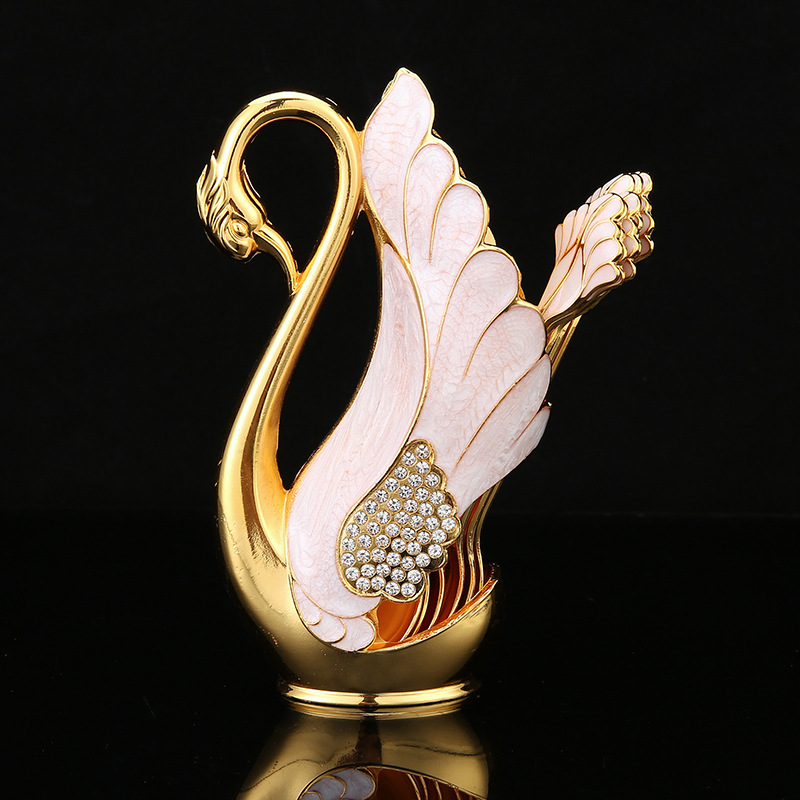 Поставката е изработена от метал във вид на лебед в цвят злато и розово.