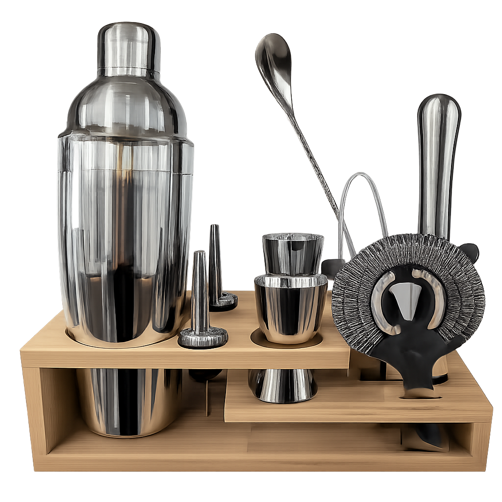 Професионален шейкър комплект с бамбукова стойка – перфектният избор за всеки бар
