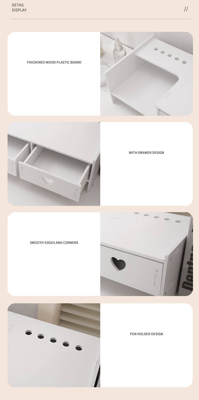 Този модерен органайзер е лазарно изрязан и предоставя идеалното решение за организация на вашия работен или козметичен плот. Изработен от издръжлив ПВЦ материал в чист бял цвят, този органайзер е идеален за хора, които ценят функционалността и стила.