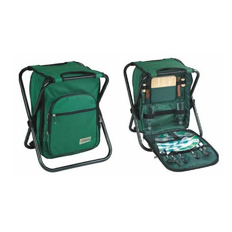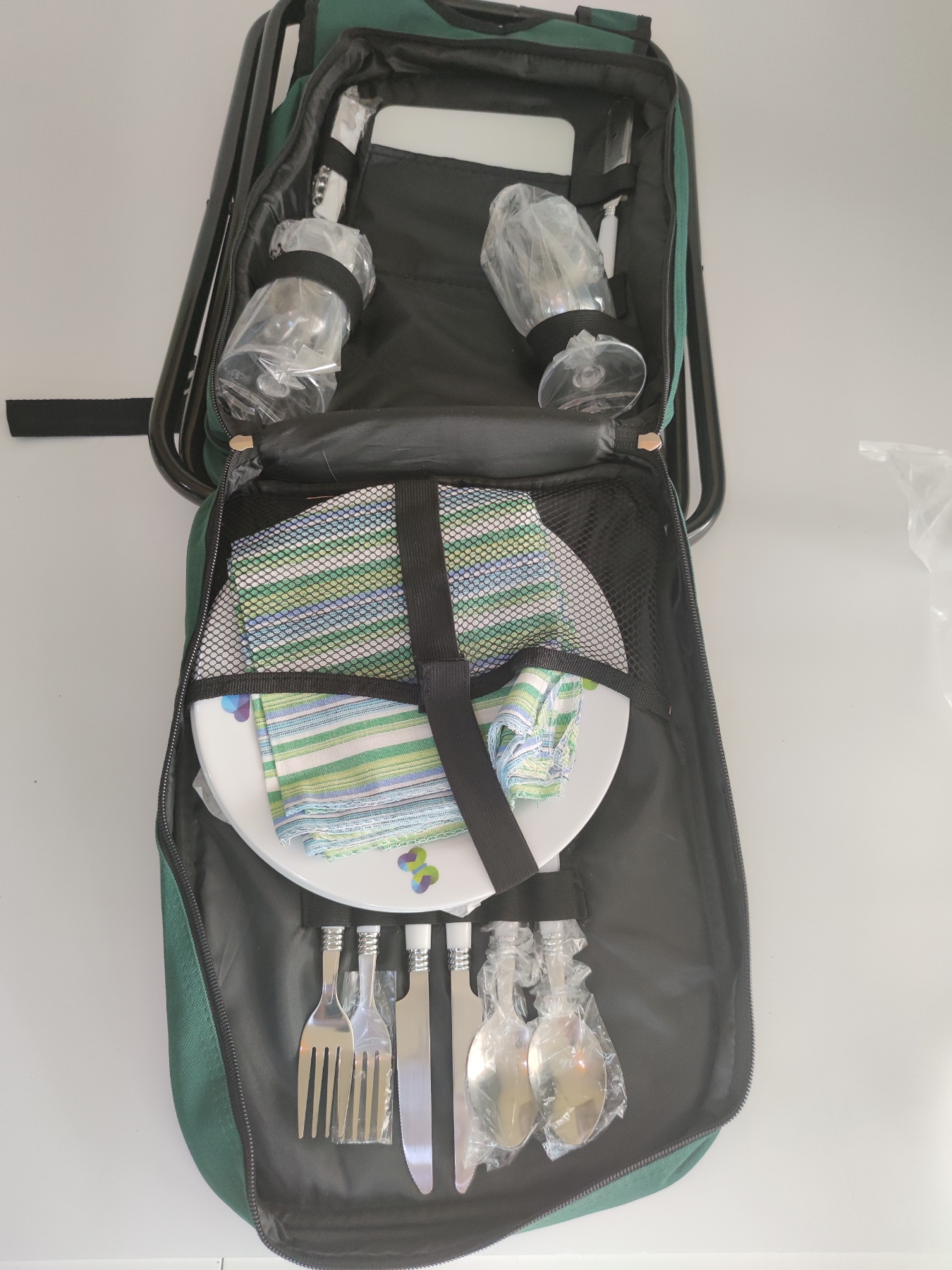 Комплектът включва сгъваемо столче и по два броя прибори от висококачествена пластмаса (също чинии, чаши, дъска за рязане, нож за мазане, тирбушон и салфетки.)