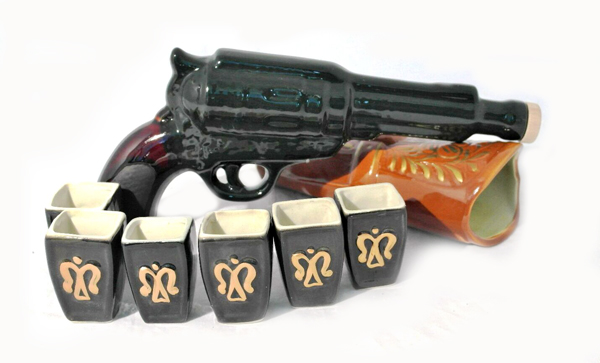 Керамичен сервиз за вино и ракия, състоящ се от гарафа с тапа, във формата на пистолет с калъф + 6бр. чаши, крадратни, декорирани със знаци.