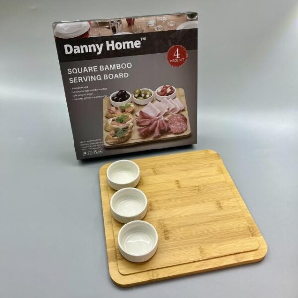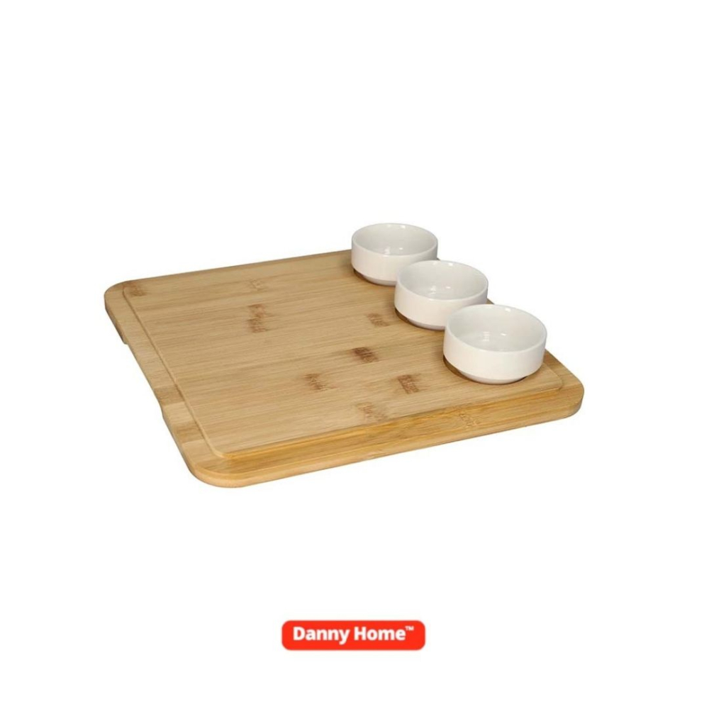 Сервизен комплект от бамбукова дъска и 3 керамични купички – стил и функционалност