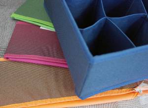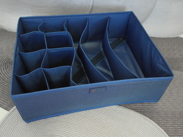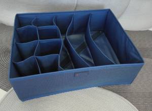 Сгъваема кутия-органайзер с правоъгълна форма, с 8 квадратни и с 3 правоъгълни отделения, с размер Н12х37,5х30 см., изработена от текстил.