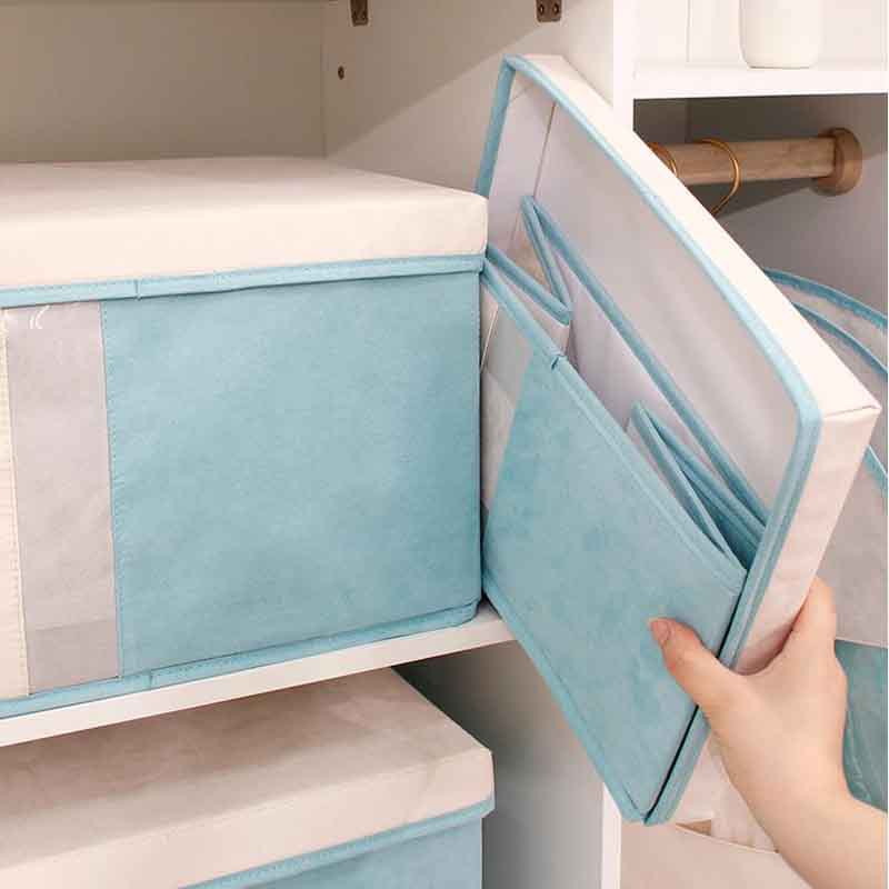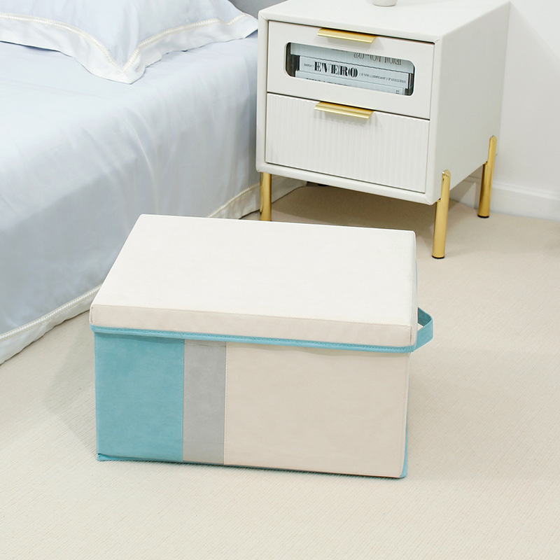 Изработена от комбинация от текстил и картон, тази кутия предлага устойчивост и лекота едновременно. В син и бежов цвят, тя е не само практична, но и добавя естетическа стойност към всяка стая. С размери 35 х 18 х 29 см, кутията е достатъчно просторна за съхранение на дрехи, играчки и други лични вещи, като същевременно заема минимално място.