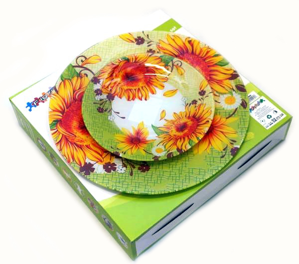 Сервизът е украсен с красив цветен принт на Слънчогледи, който го прави подходящ както за специални поводи, така и за ежедневна употреба. Изработен е от висококачествено стъкло, което го прави здрав и издръжлив.