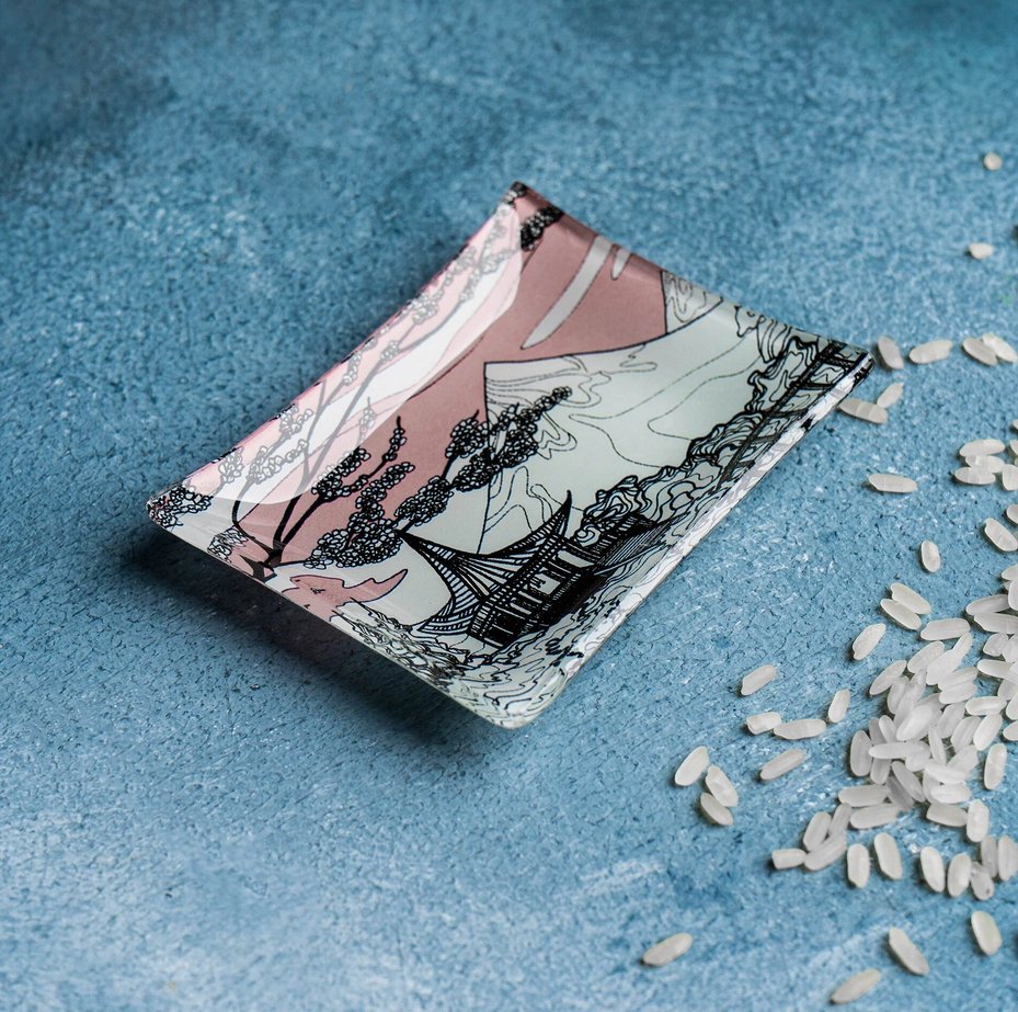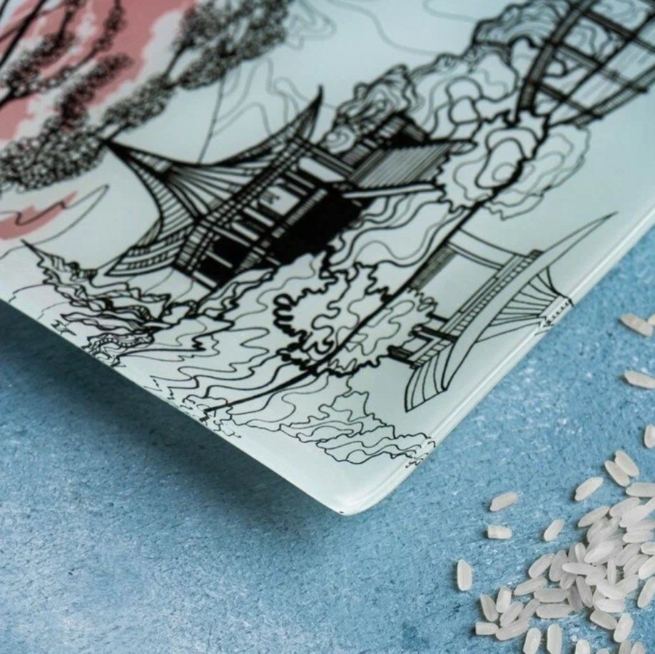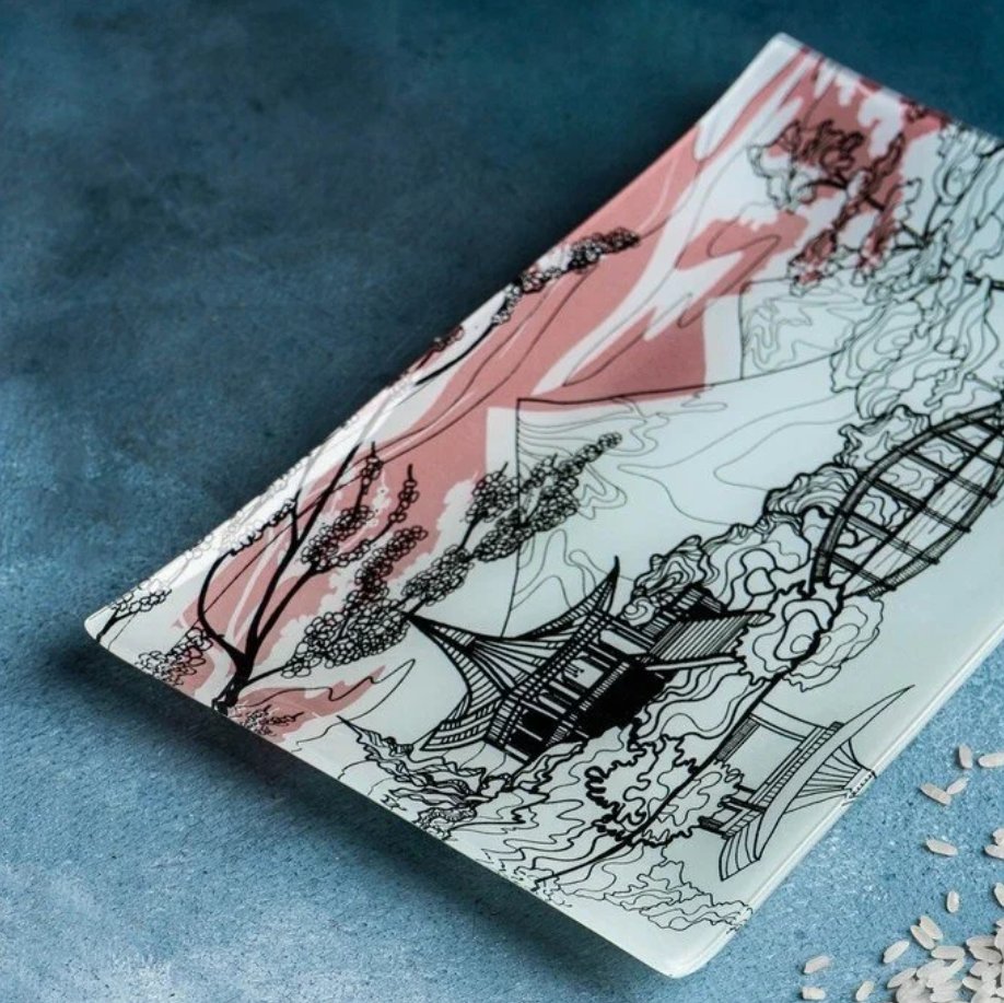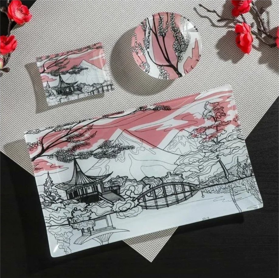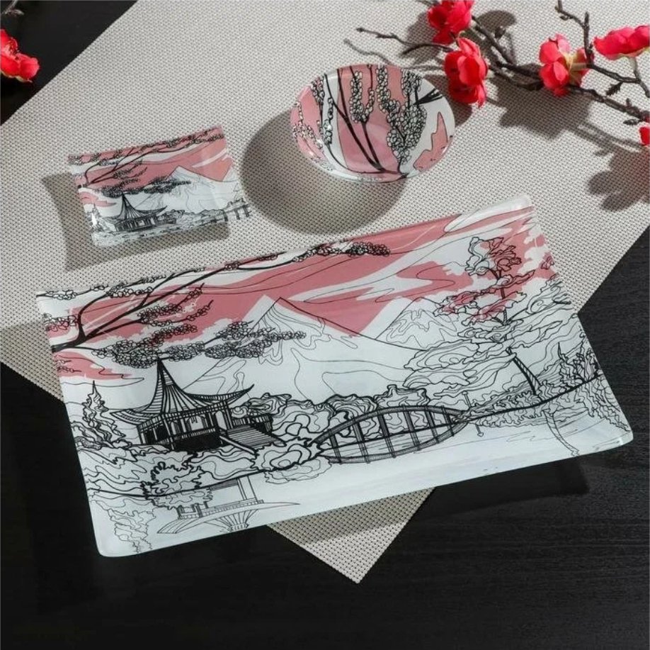 Изпитайте магията на японския залез с нашия Стъклен комплект за Суши "Залез в планината".