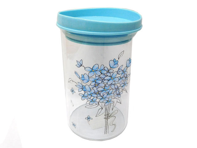 Бурканът изработен от стъкло, с цветен принт със сини цветя и син пластмасов капак.