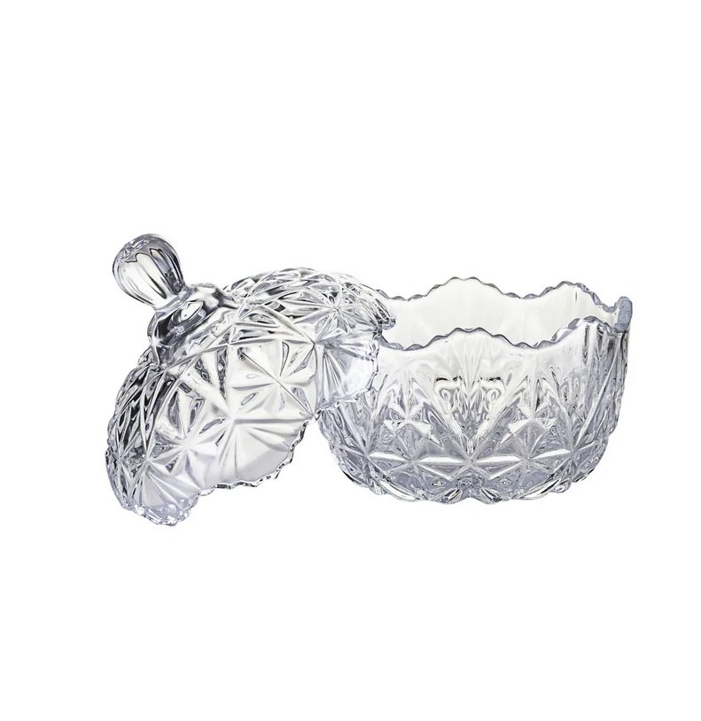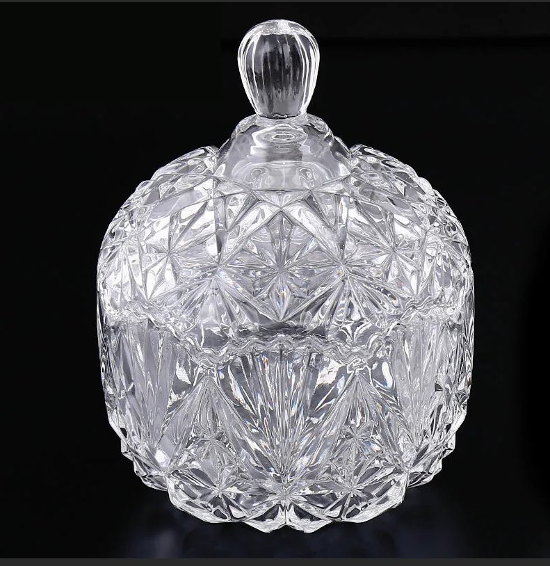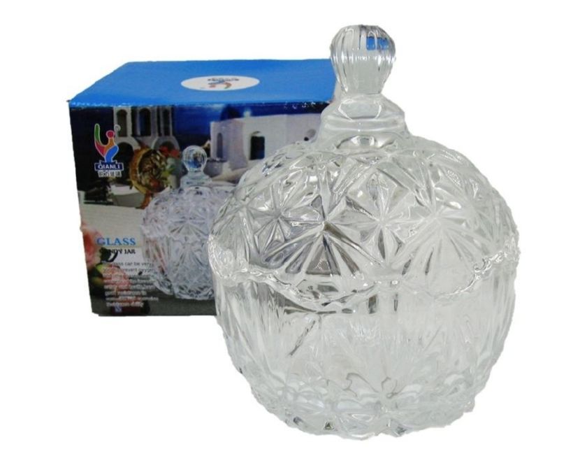 Бонбониерата е изработена от стъкло с релефна повърхност.