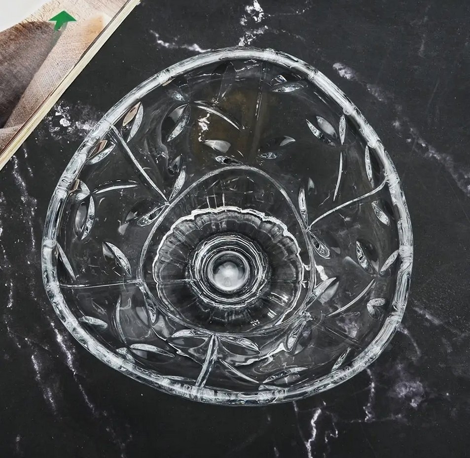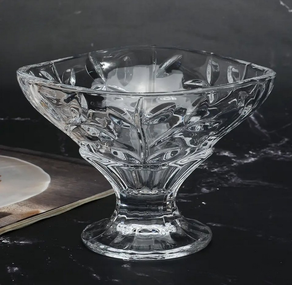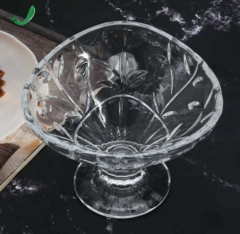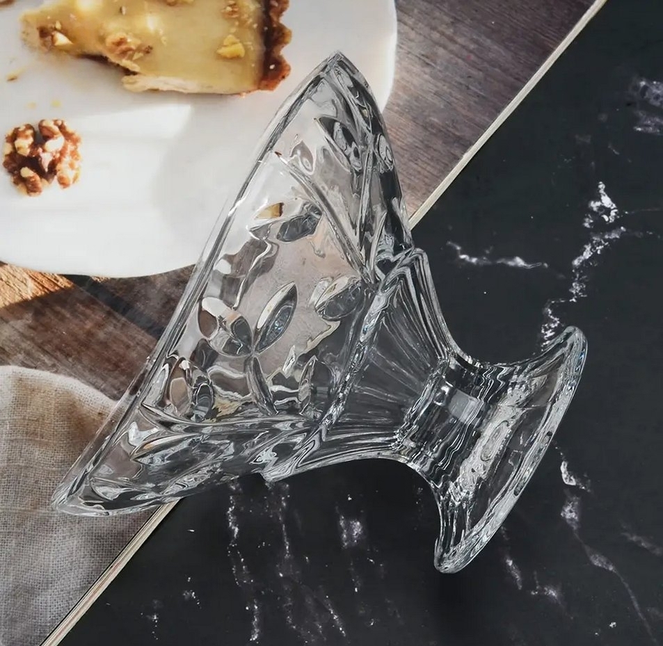 Прозрачна стъклена купичка със столче, с размер Н9,5х13,5 см. и с красив релефен дизайн. Подходяща е за сервиране на сладолед, бонбони, плодове и др.