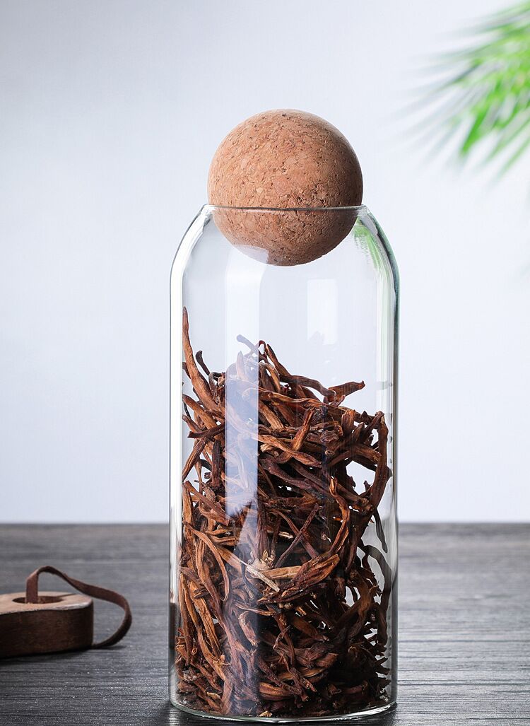 Има коркова тапа във формата на топка, която плътно затваря гърлото на буркана.