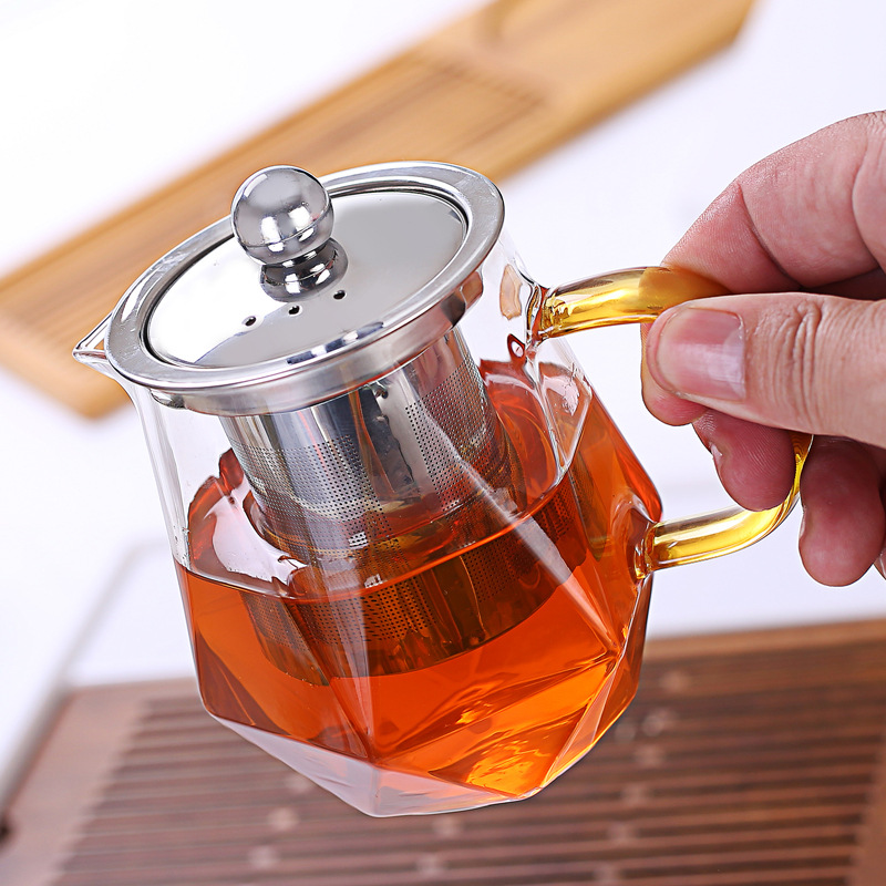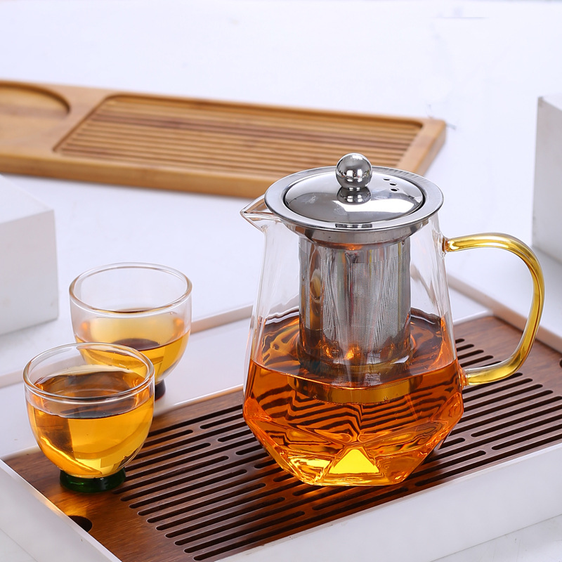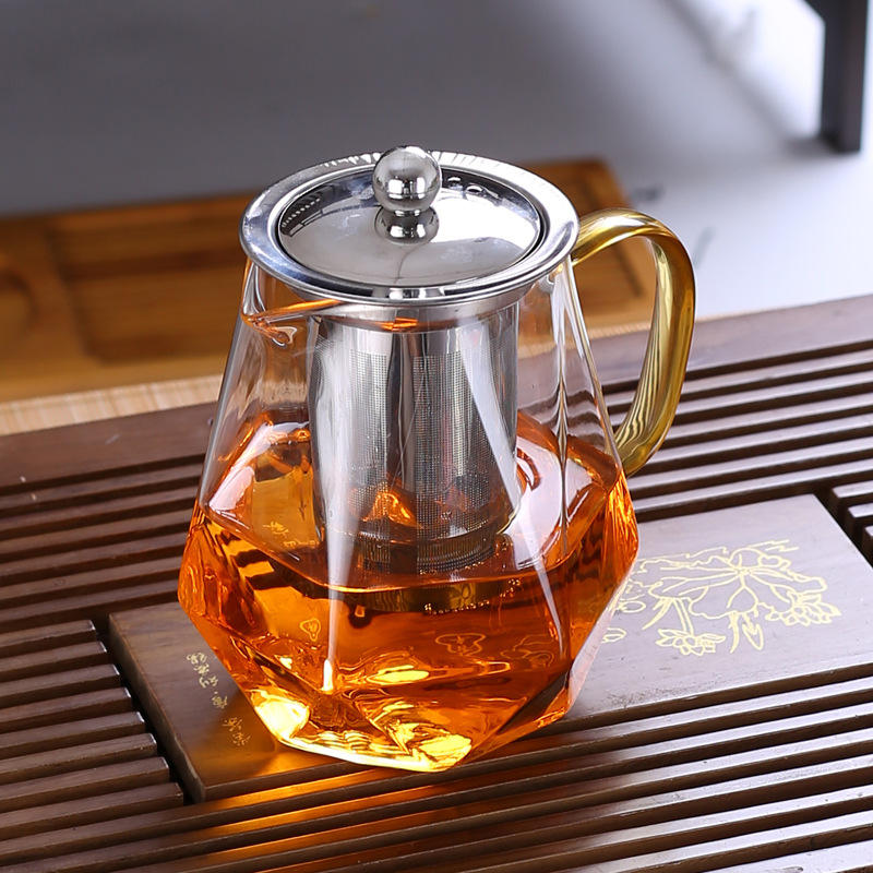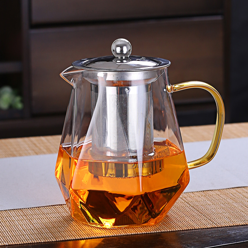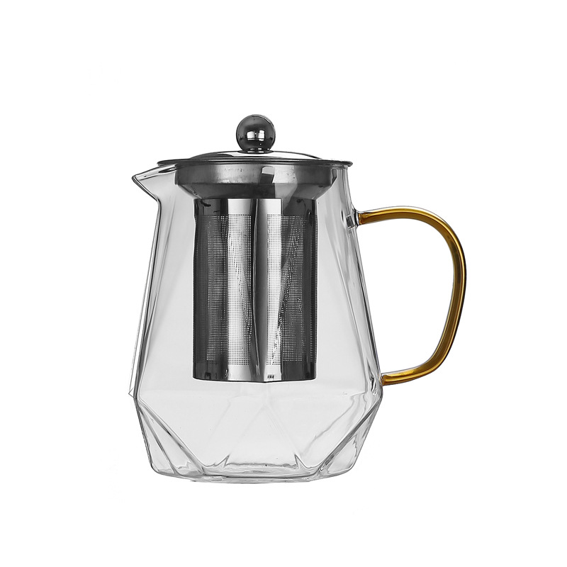 Чайникът е изработен от безцветно боросиликатно стъкло с дръжка в златист цвят, устойчиво на високи температури и цедка и капак от неръждаема стомана.