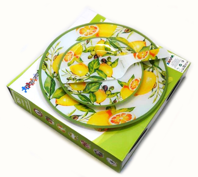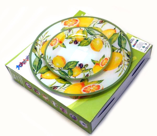 Стъклен сервиз з торта от 8 части, с цветен принт на Лимони, включващ: