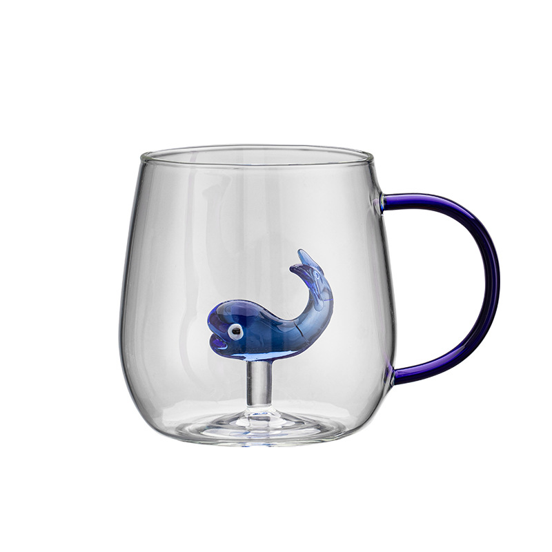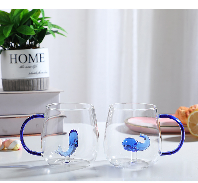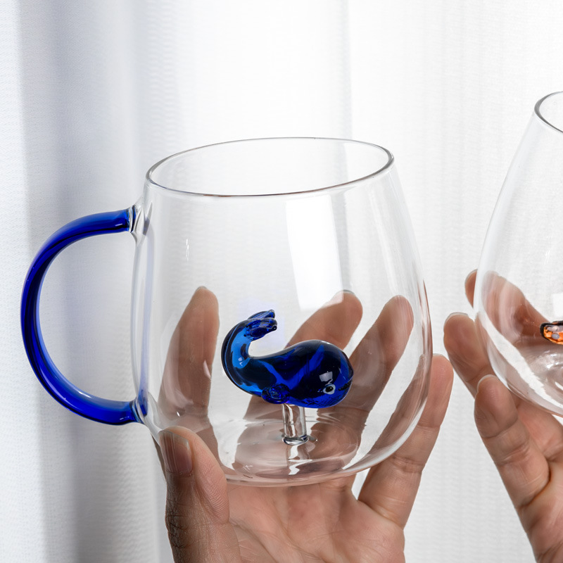 Чашата е изработена от стъкло, на дъното на която има фигурка на Делфин в син цвят.