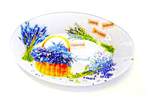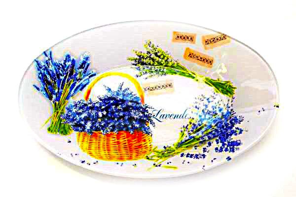 Платото е изработено от стъкло в овална форма с принт на лавандула.
