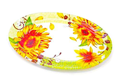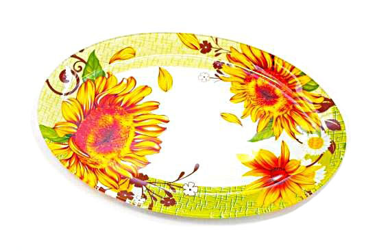 Платото е изработено от стъкло в овална форма с принт на Слънчогледи.