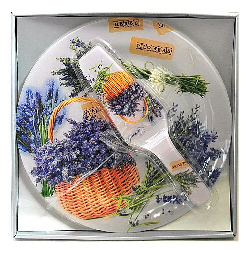 Стъклено плато за торта с лопатка "Лавандула с кошница"