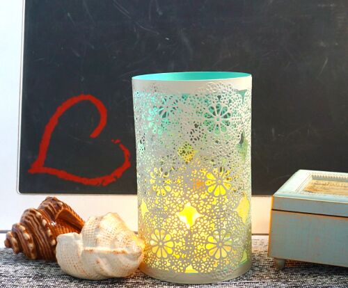 - Цвят на свещника: бял отвън, тюркоазен отвътре – стилен контраст