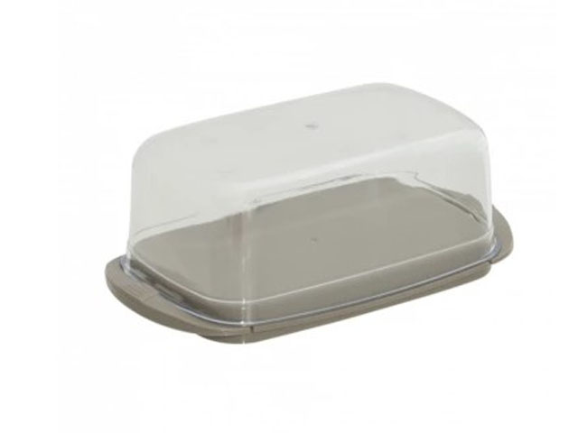 Удобен и практичен правоъгълен пластмасов съд за съхранение на масло, маргарин и сирене, с размер 17х10х7 см. и с красив дизайн в цвят какао, с прозрачен капак.