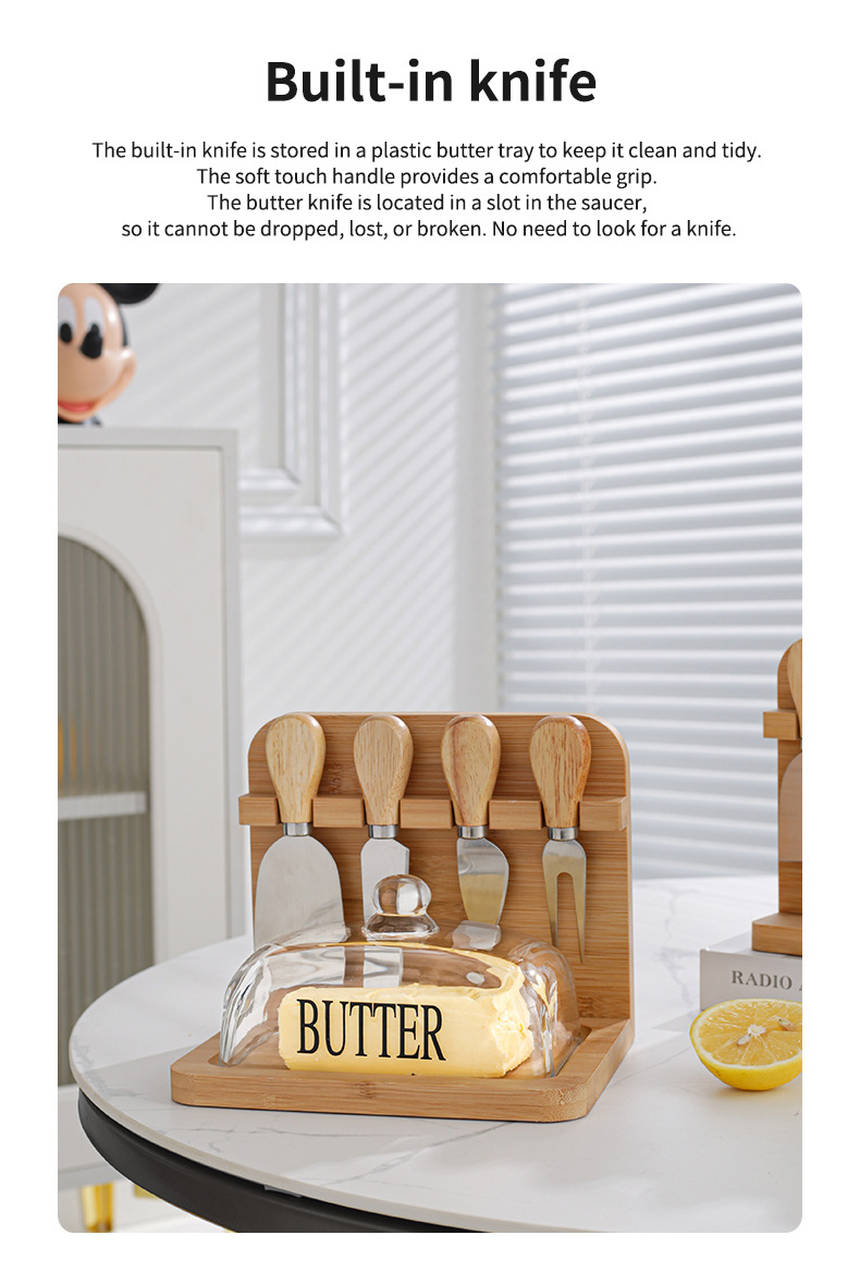 Съд за масло със стъклен капак, бамбукова подложка и комплект ножове – елегантност и удобство в едно