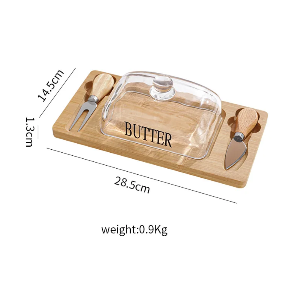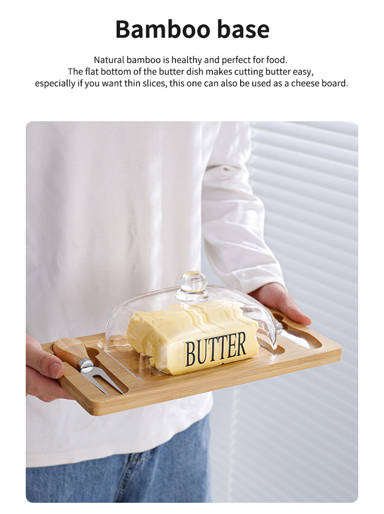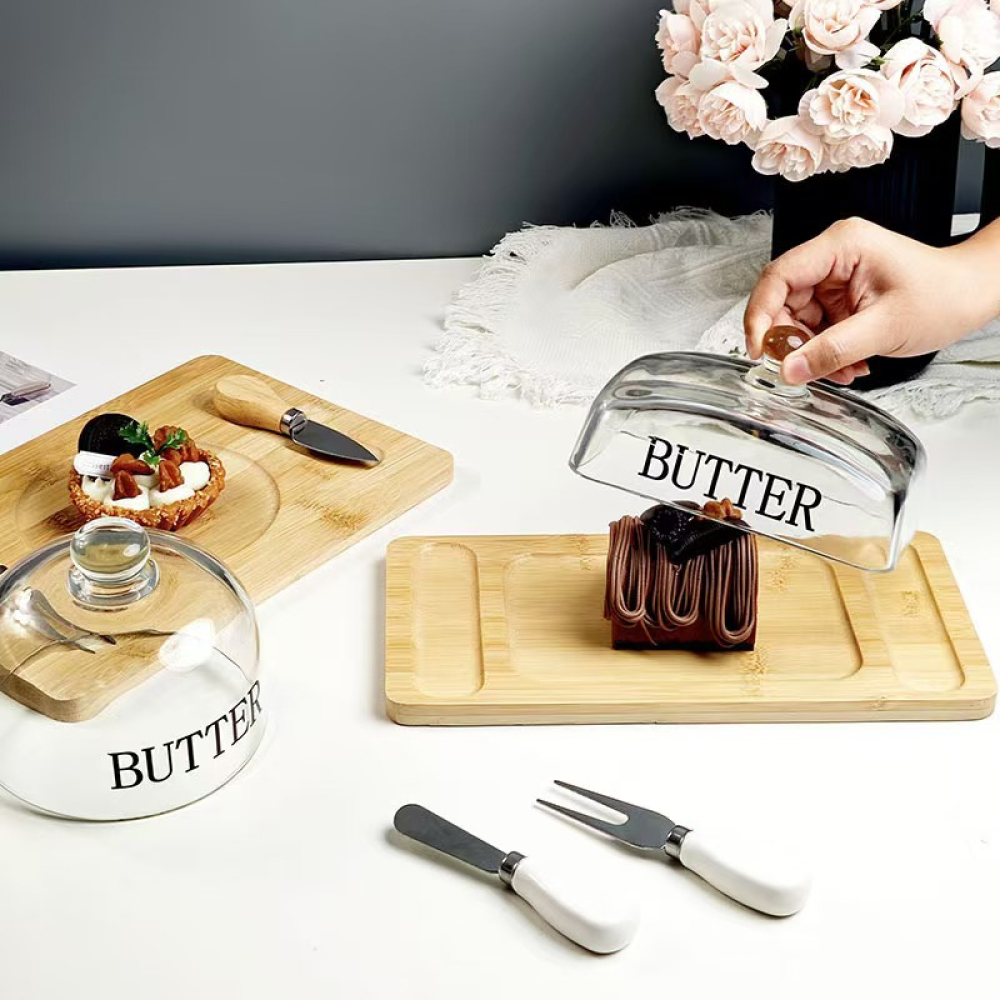 Съд за масло със стъклен капак и бамбукова подложка – изискано сервиране с практичен акцент